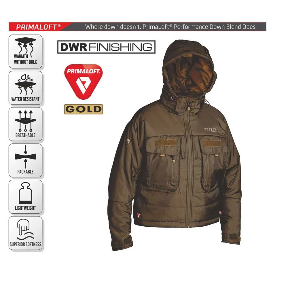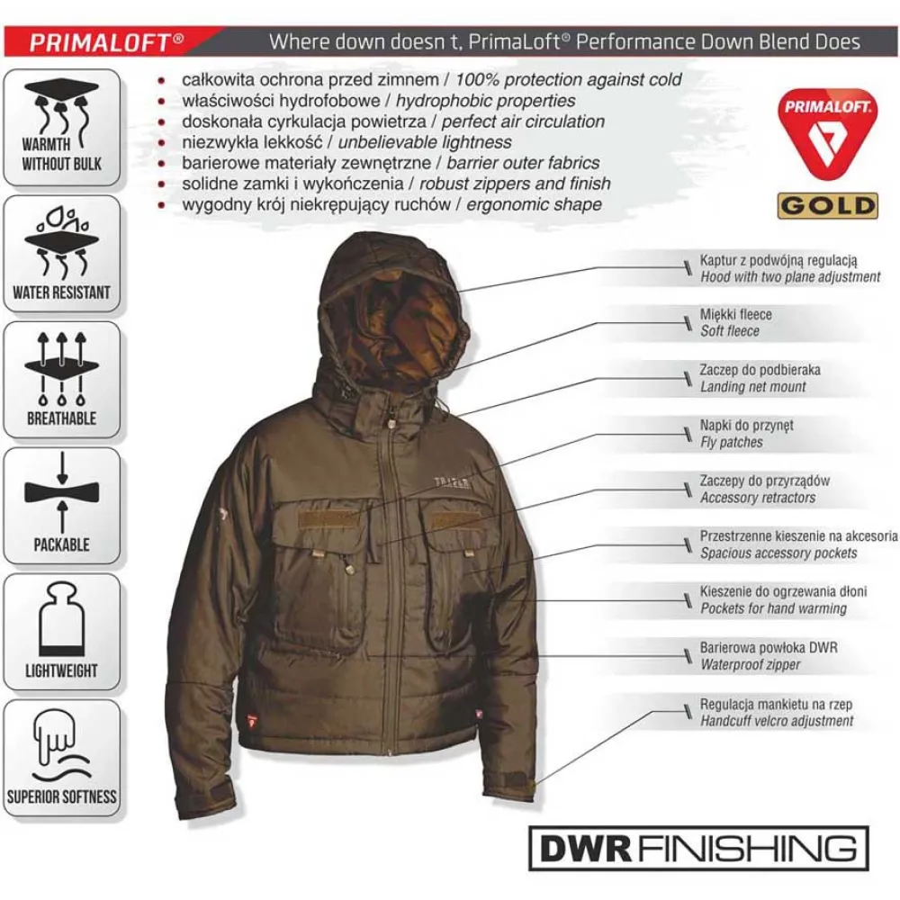 Невероятно прочный, барьерный внешний материал с гидрофобным слоем DWR покрывает невероятно теплый внутренний утеплитель Prima Loft Gold Active плотностью 133 г. Он гарантирует полный тепловой комфорт. Очень уютная, легкая куртка оснащена регулируемым капюшоном, который крепится на застежке. Талия регулируется. Вместительные двойные нагрудные карманы для коробок и аксессуаров. Рядом с карманами расположены скрытые ретракторы для кусачек и плоскогубцев. На спинке предусмотрено крепление для подсака. Наручники фиксируются на липучке. urach.