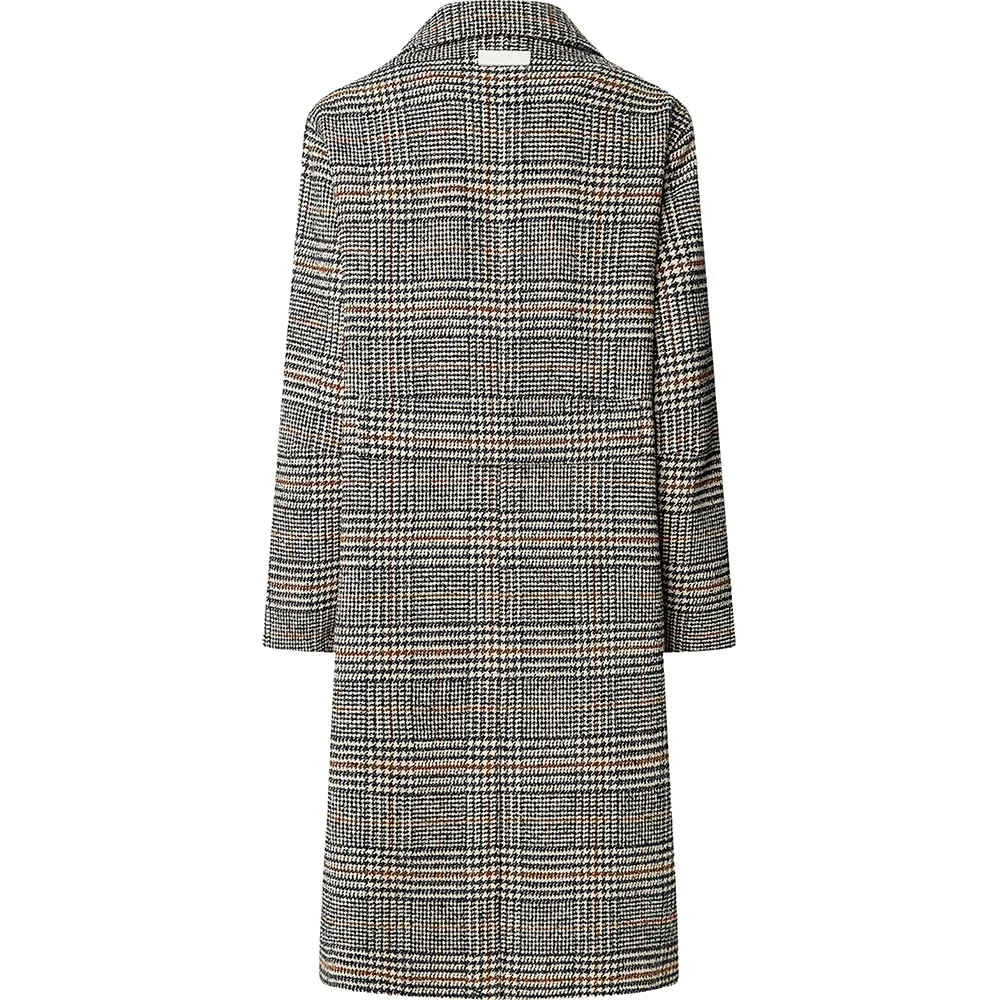 Однобортное полушерстяное пальто в тонкую клетку с ремешком сзади основного качества.