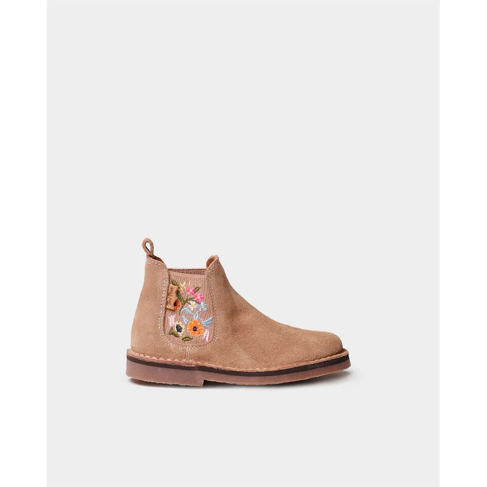 Они выполнены из замши с цветочной вышивкой на боковых резинках.