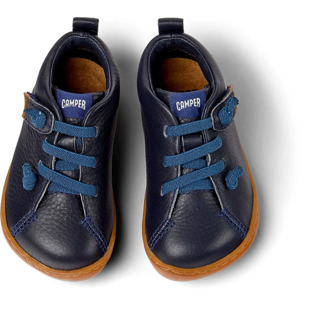 Синие кожаные туфли для детей с эластичными шнурками и системой застегивания на крючок и петлю и 100% резиновой подошвой (20% переработано).