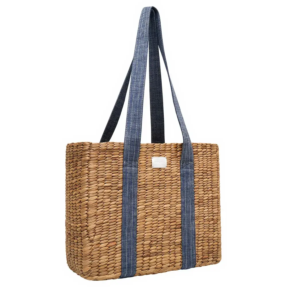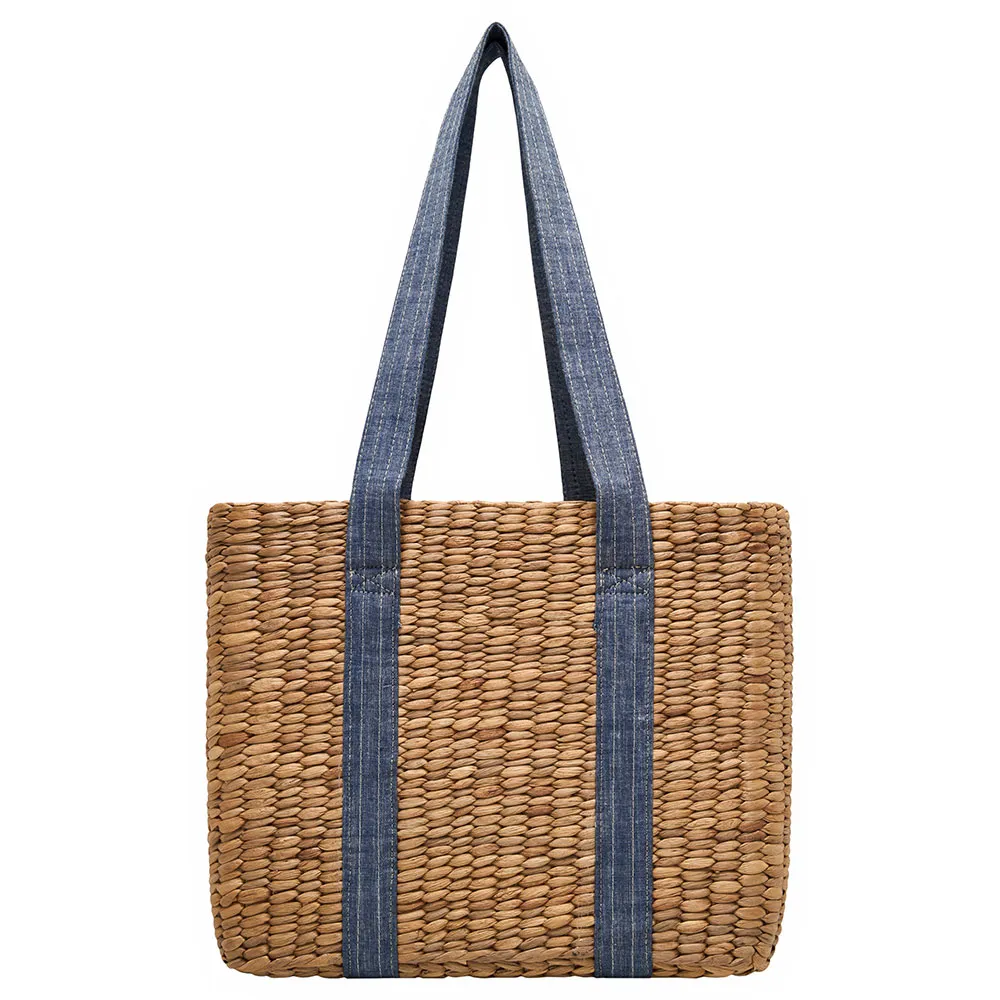 100% солома, пшеничная солома, Без застежки, Пляжная сумка, этикетка из искусственной кожи, Структурированное плетение, Застежка на молнию, джинсовые ремешки.