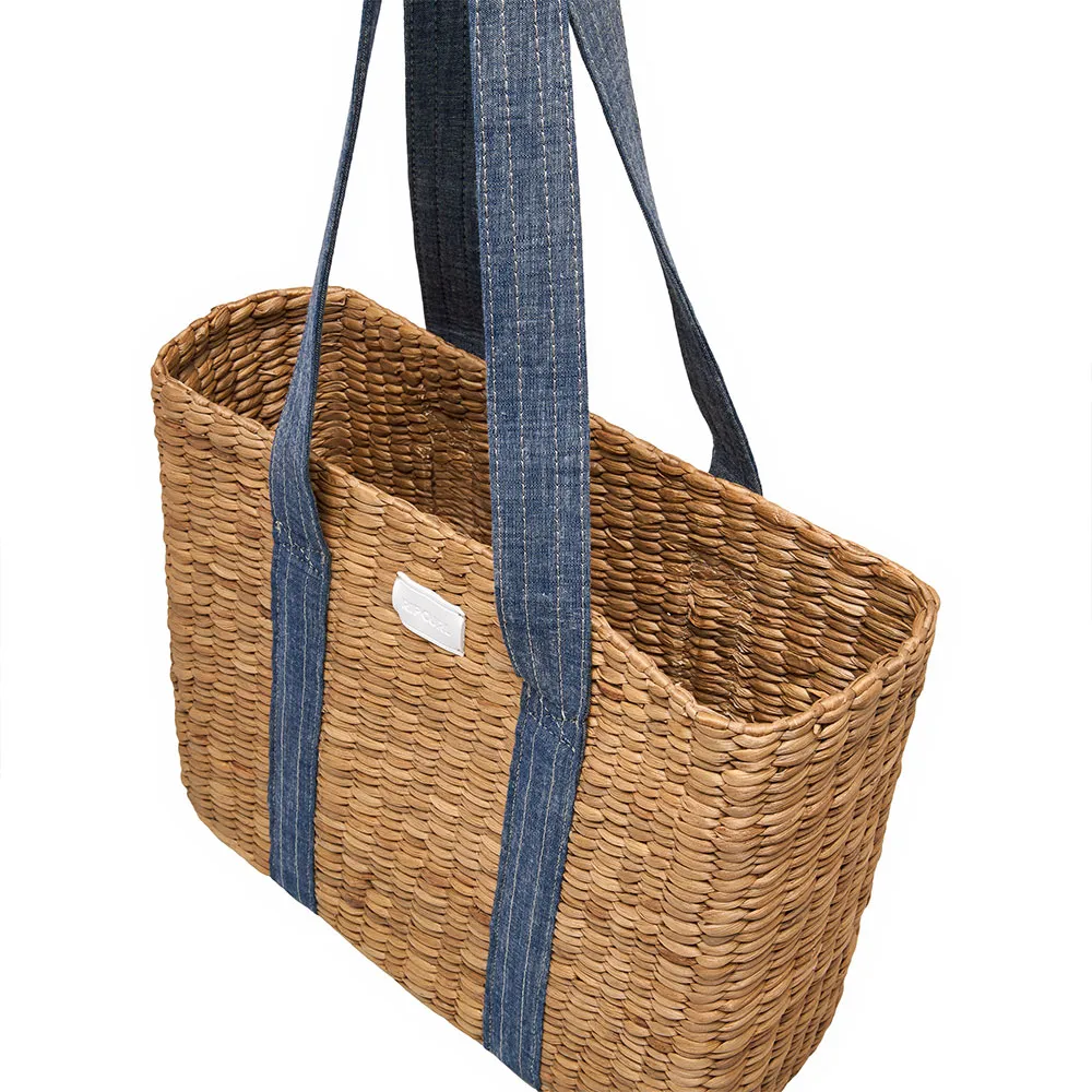 Сшитый из соломы пшеничной травы, он имеет структурированное плетение, этикетку из искусственной кожи и джинсовые ремешки для стильного, но функционального пляжного компаньона.