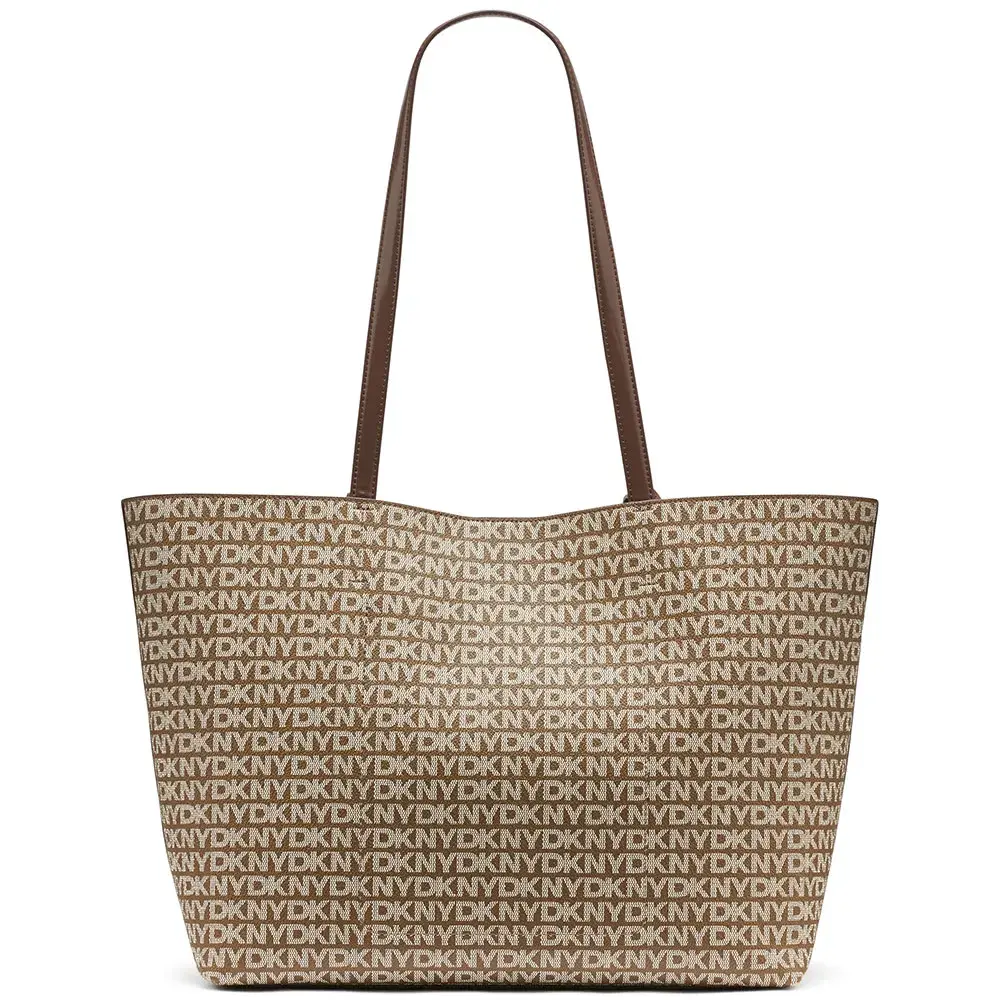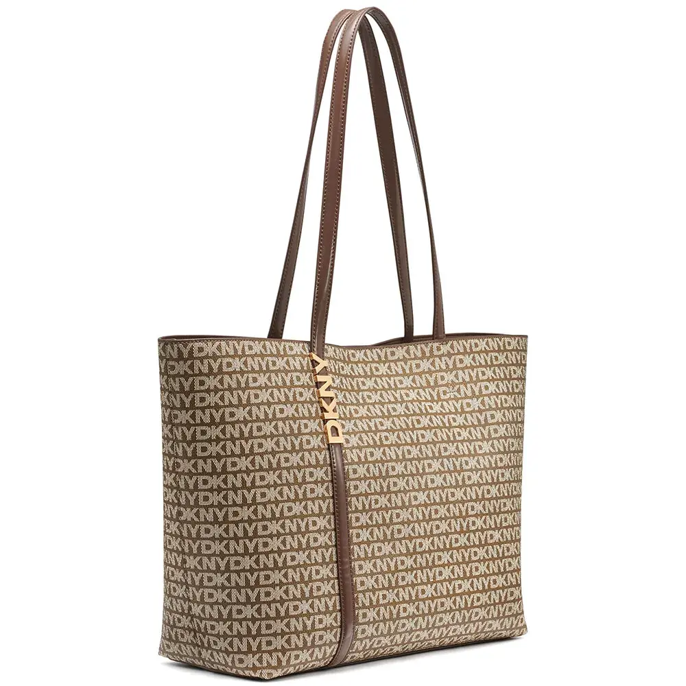Мгновенно узнаваемая сумка через плечо в стиле Avril tote с монограммой и вертикальной лентой с металлическим логотипом спереди, подчеркивающей стиль. Фирменный принт по всему телу излучает неподвластную времени роскошь, а изящная вертикальная полоса создает современный контраст, кульминацией которого является отполированный металлический логотип DKNY, служащий отличительным знаком качества и высокой моды. Эта сумка - не просто аксессуар; это продолжение вашего личного стиля, призванное дополнить любой образ, от строгого делового костюма до повседневных джинсов и блейзера.