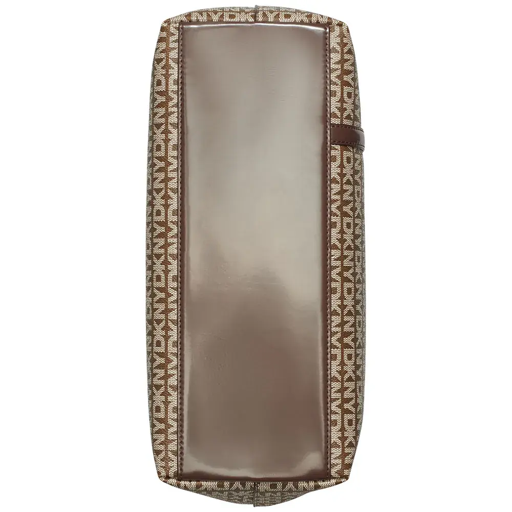 * Внешние детали: Фирменный принт с монограммой по всей поверхности, контрастная вертикальная полоса спереди, полированная металлическая табличка с логотипом DKNY