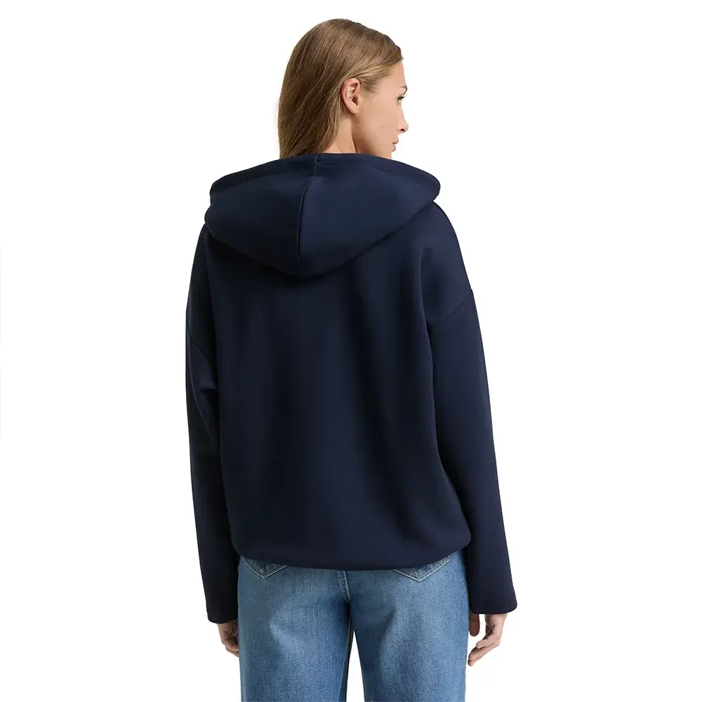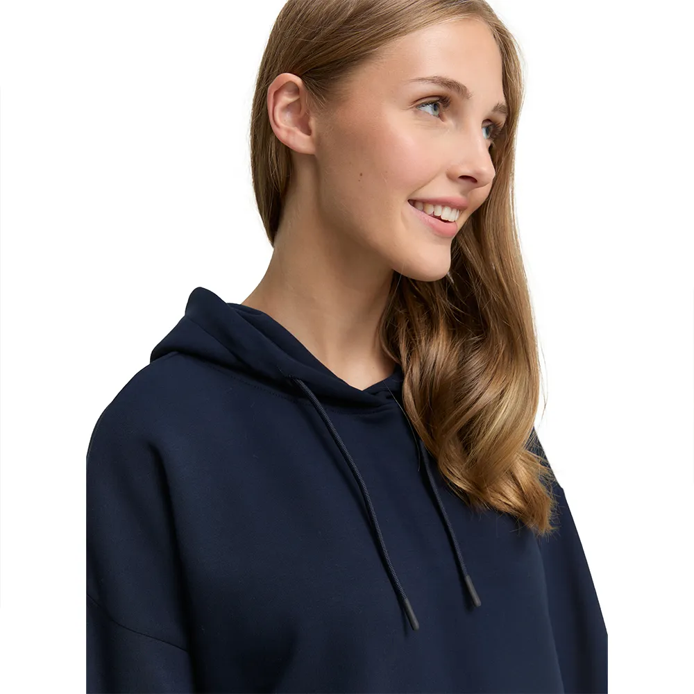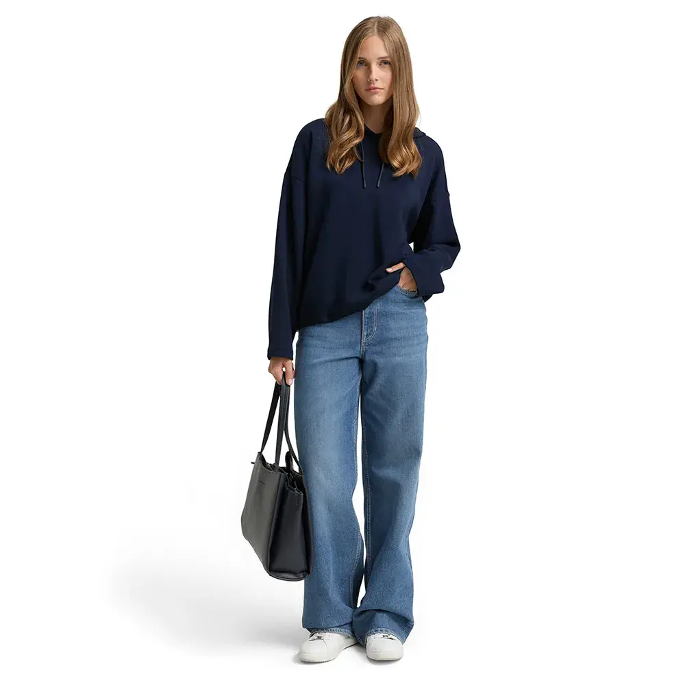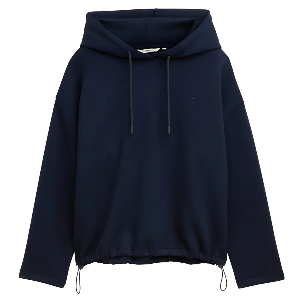 Толстовка с капюшоном на завязках и заниженным плечевым швом для свободного кроя.