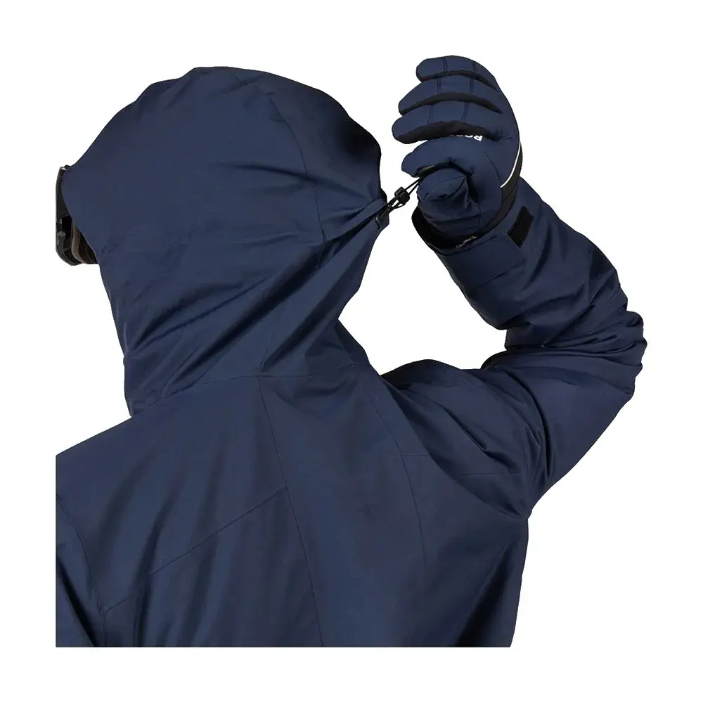 Включает технические детали для лыжников, такие как снежная юбка, несъемный капюшон, манжеты с отверстиями для больших пальцев и водонепроницаемые молнии YKK.
