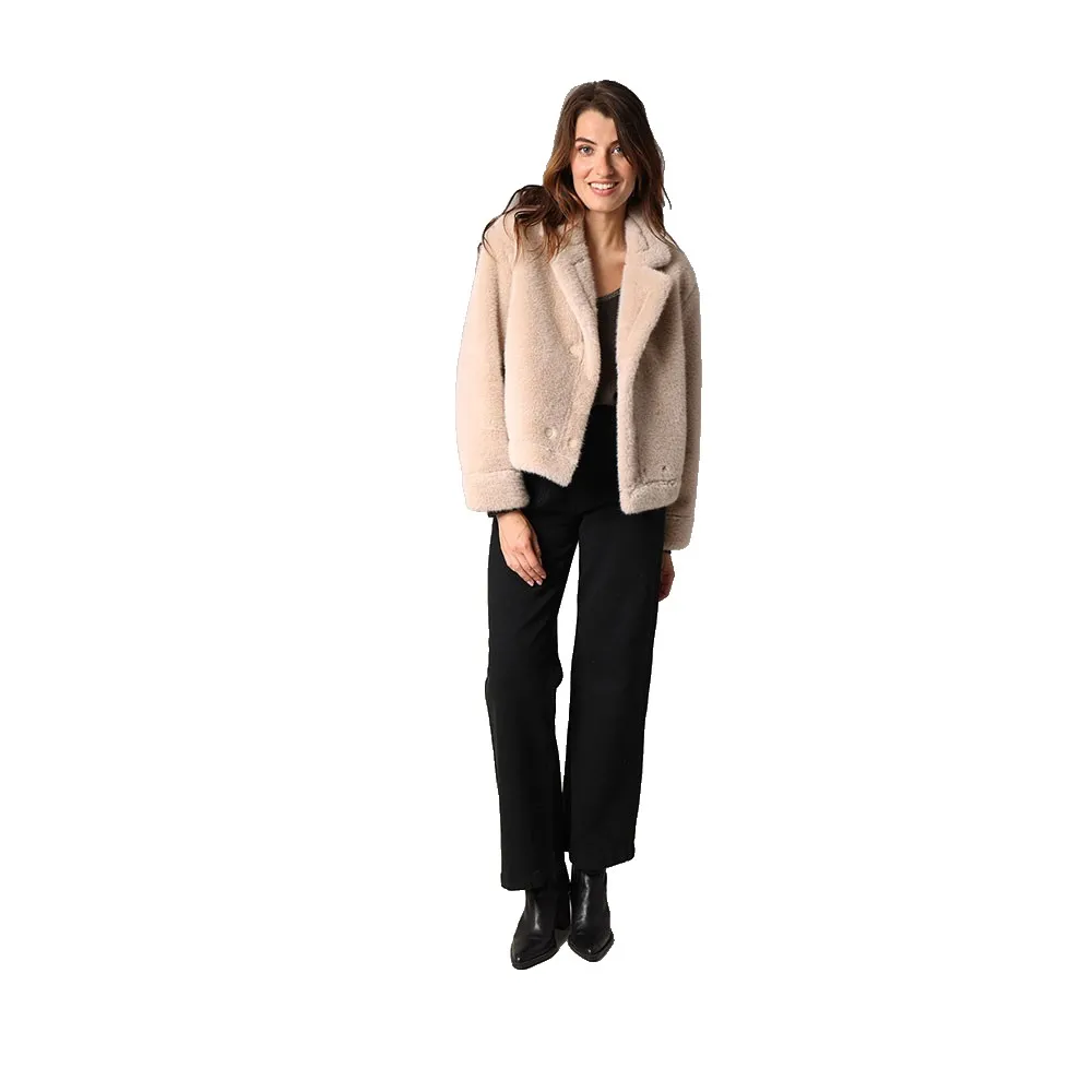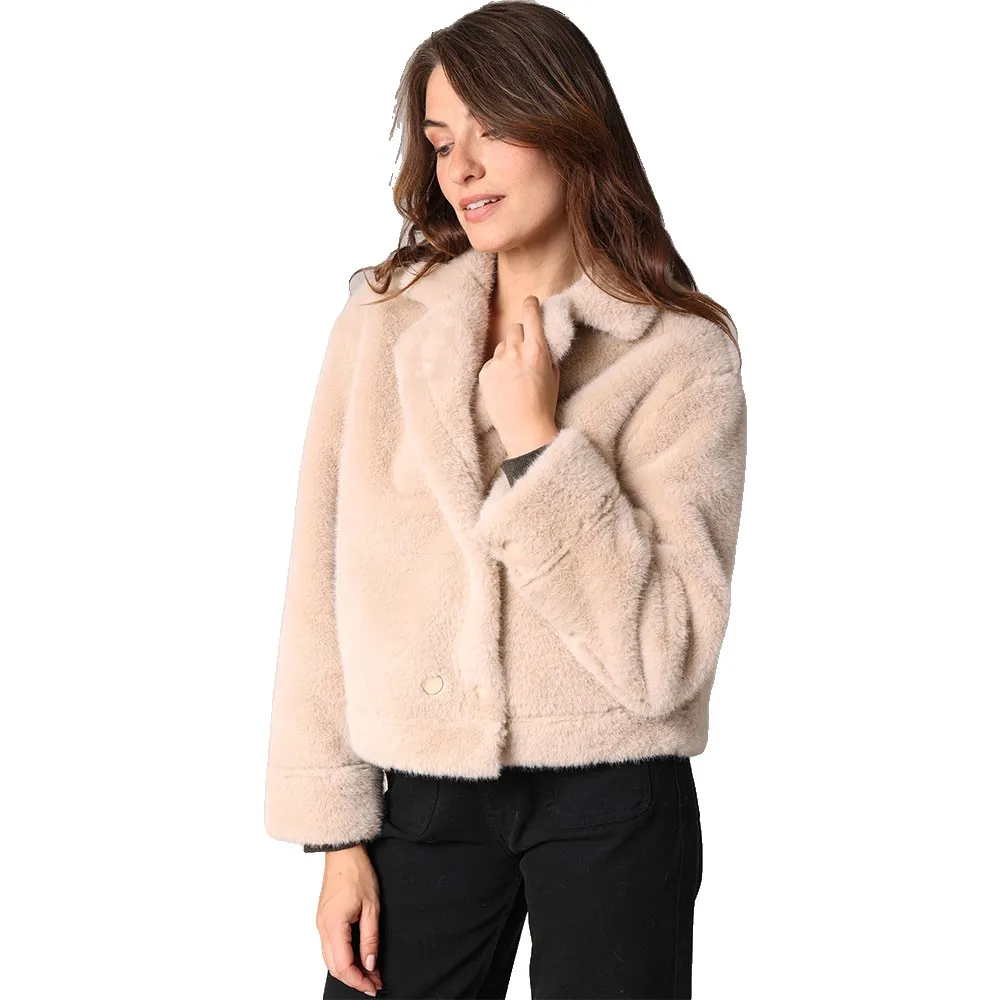 Эта короткая куртка из искусственного меха вдохнет в ваш гардероб нотку нежности, сочетающую в себе шик, тепло и очарование. Специально подобранный воротник, достойный самых элегантных силуэтов, деликатно облегает шею, а прямой, слегка свободный крой обеспечивает максимальный комфорт без ущерба для стиля. Двубортная застежка на пуговицы тон в тон придает изделию нотку ретро, что идеально подходит для оживления вашего городского образа или романтических прогулок. Атласная подкладка и замысловатая отделка обещают сделать эту модель обязательным атрибутом сезона.