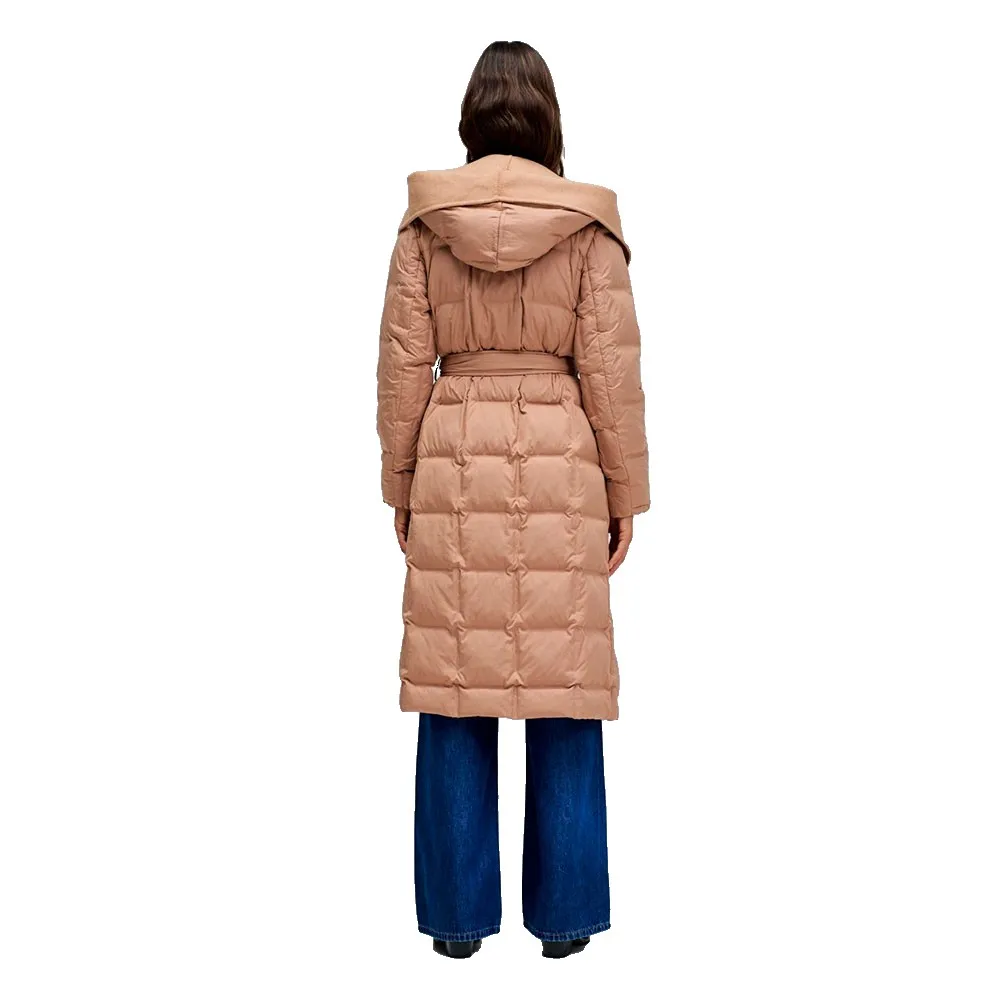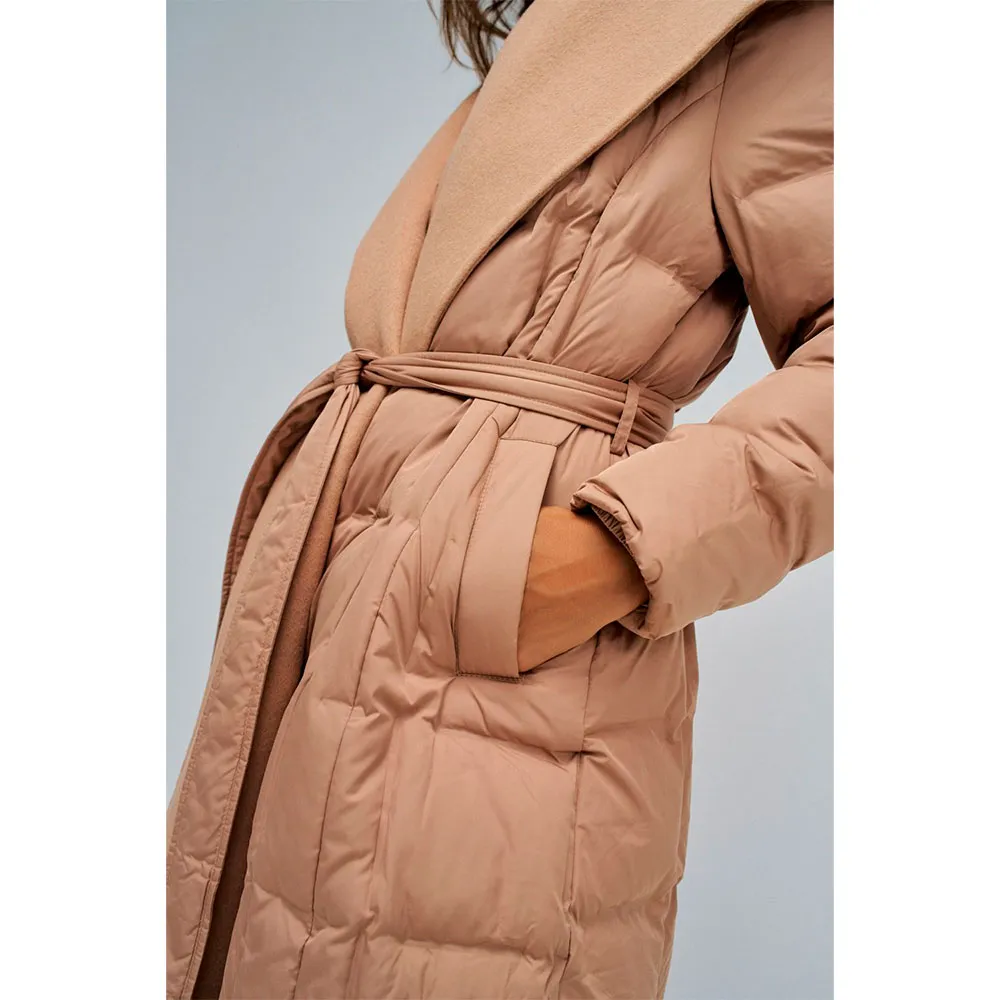 Это длинное бежевое пуховое пальто нежно облегает вас, становясь идеальным союзником в холодные дни.