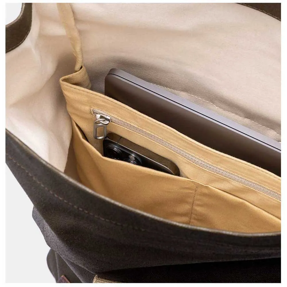 Pickwick Cotton Canvas - это велосипедный рюкзак с сворачивающимся верхом, дизайн которого дополняет удобство, присущее городским велопрогулкам. Изготовленный из водостойкого хлопка с деталями из кожи Brooks растительного дубления, Pickwick - это рюкзак с внутренним отделением для ноутбука и одним потайным карманом на задней стороне. Застежка-сворачивающийся верх позволяет расширить объем, а плечевые пряжки позволяют быстро и легко регулировать размер. Рюкзак для езды на велосипеде по городу: карман и сворачивающийся верх плотно прилегают к спине, сохраняя элегантный вид и обеспечивая сохранность вещей.