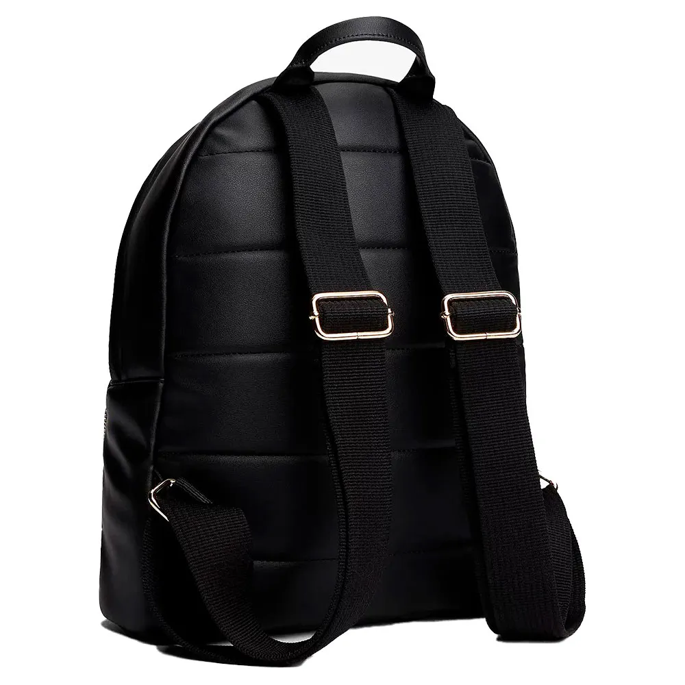 Черный рюкзак soft dome из линейки Popette с золотистыми вставками, передним карманом на молнии и структурированным силуэтом, обеспечивающим элегантную функциональность.