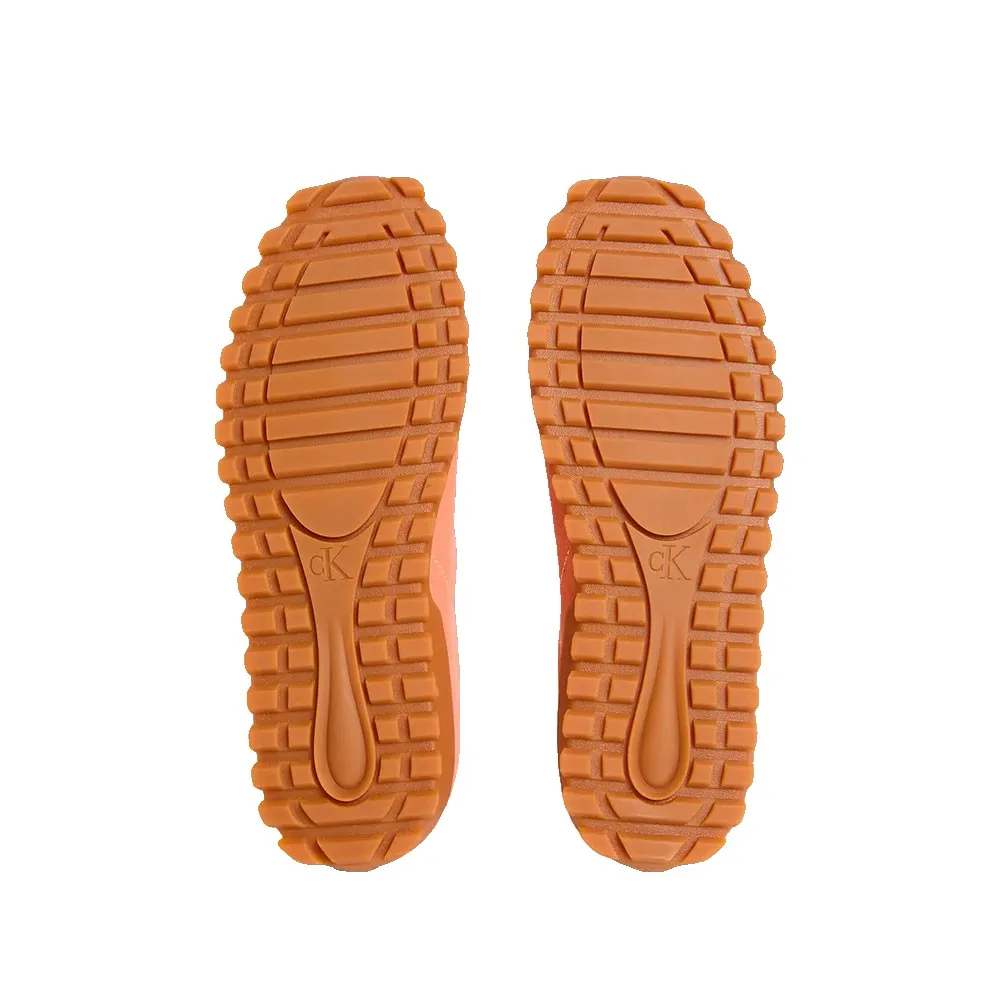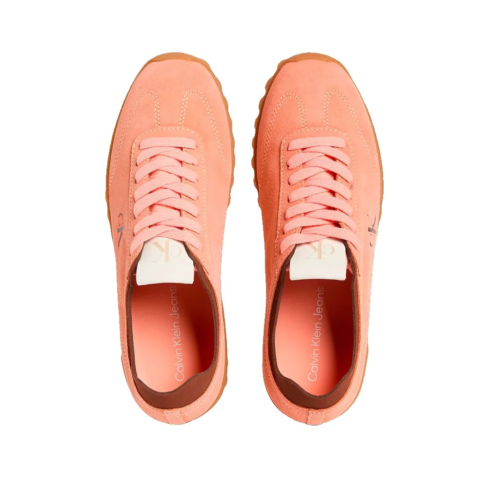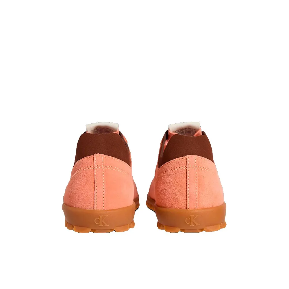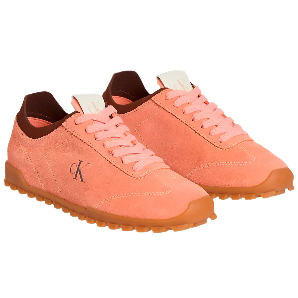 Женская низкопрофильная замшевая дорожка кораллового цвета с бордовыми деталями и логотипом ck сбоку.