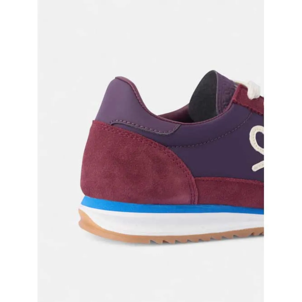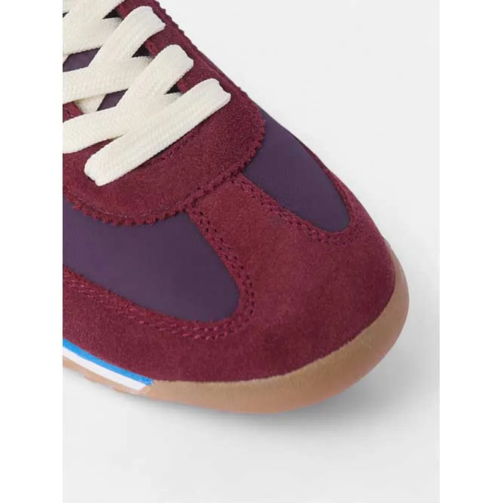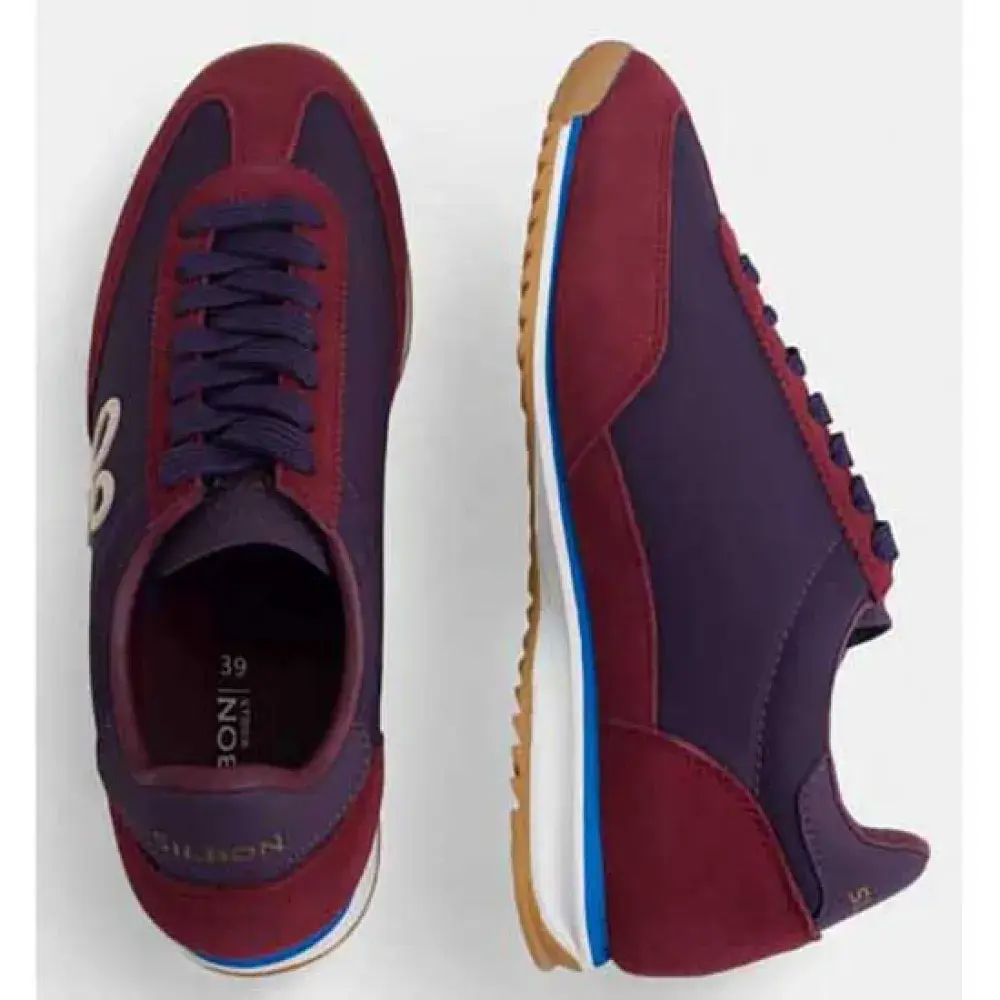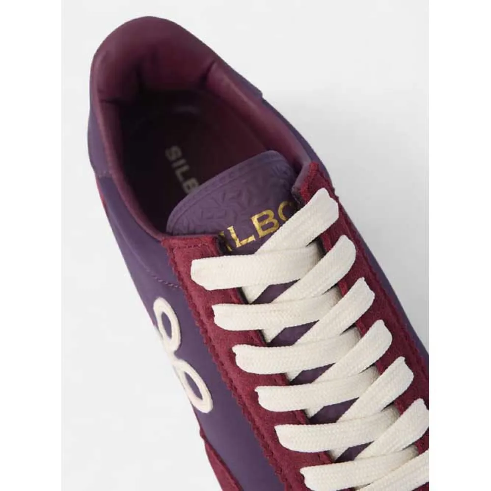 Кроссовки из замши и текстиля. Они оснащены застежкой на шнуровке из сыромятной кожи и кожаным язычком с тисненой надписью "silbon". Они отделаны мыском, верхом и пяткой из замши темно-бордового цвета с потертостями кремового цвета по бокам.