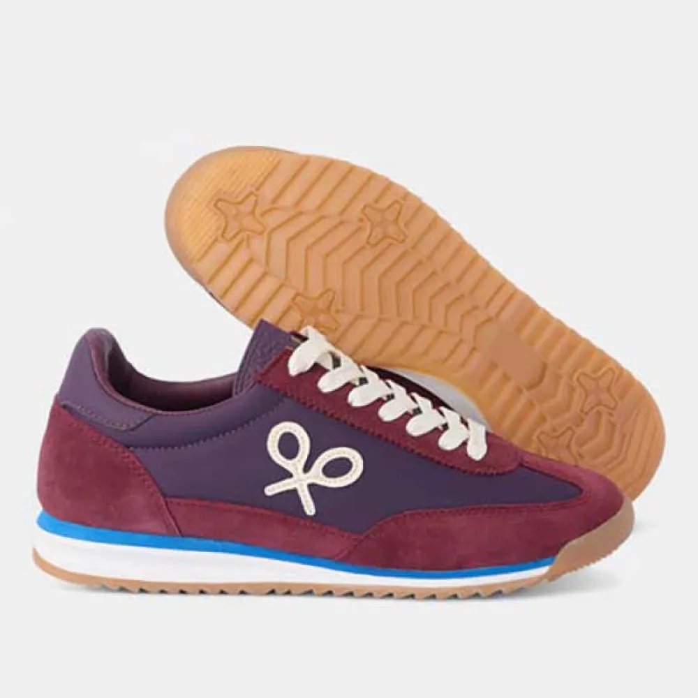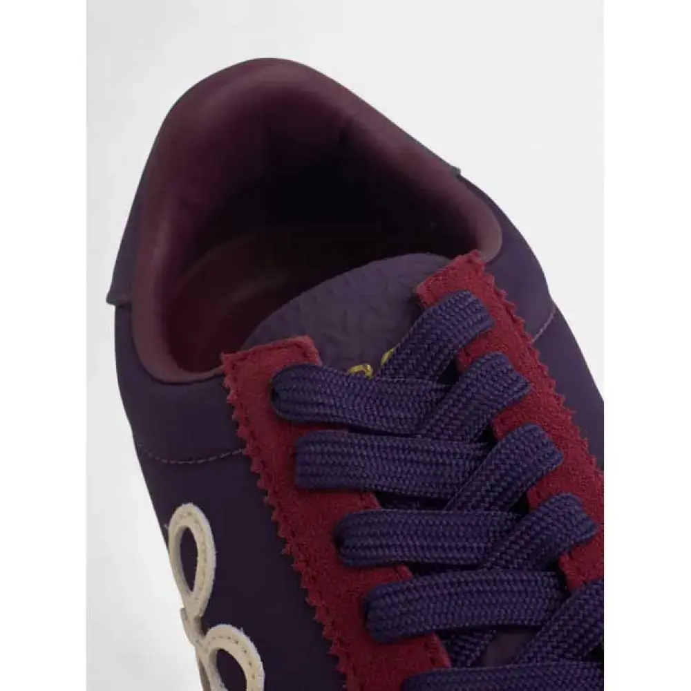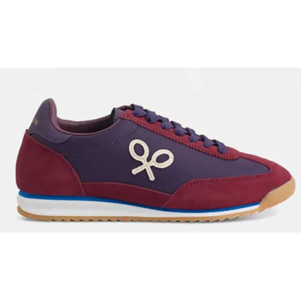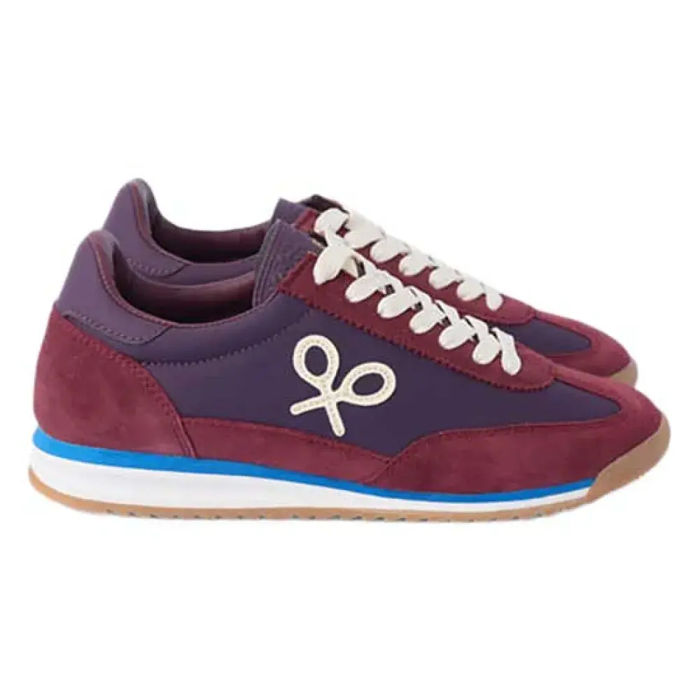 Кроссовки из замши и текстиля. Они оснащены застежкой на шнуровке из сыромятной кожи и кожаным язычком с тисненой надписью "silbon". Они отделаны мыском, верхом и пяткой из замши темно-бордового цвета с потертостями кремового цвета по бокам.