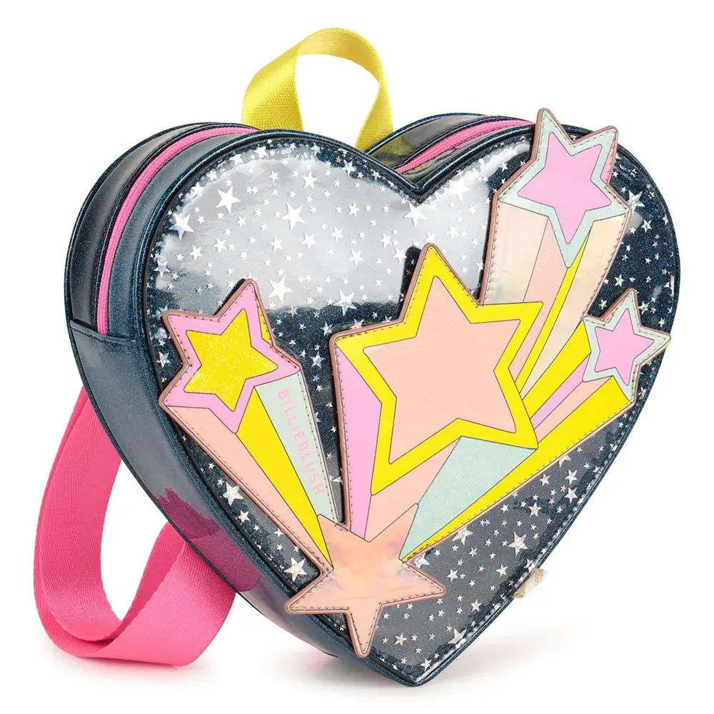 Маленький рюкзак в форме сердца, ткань, покрытая блестками, переливающиеся звезды из прозрачного ПВХ.
