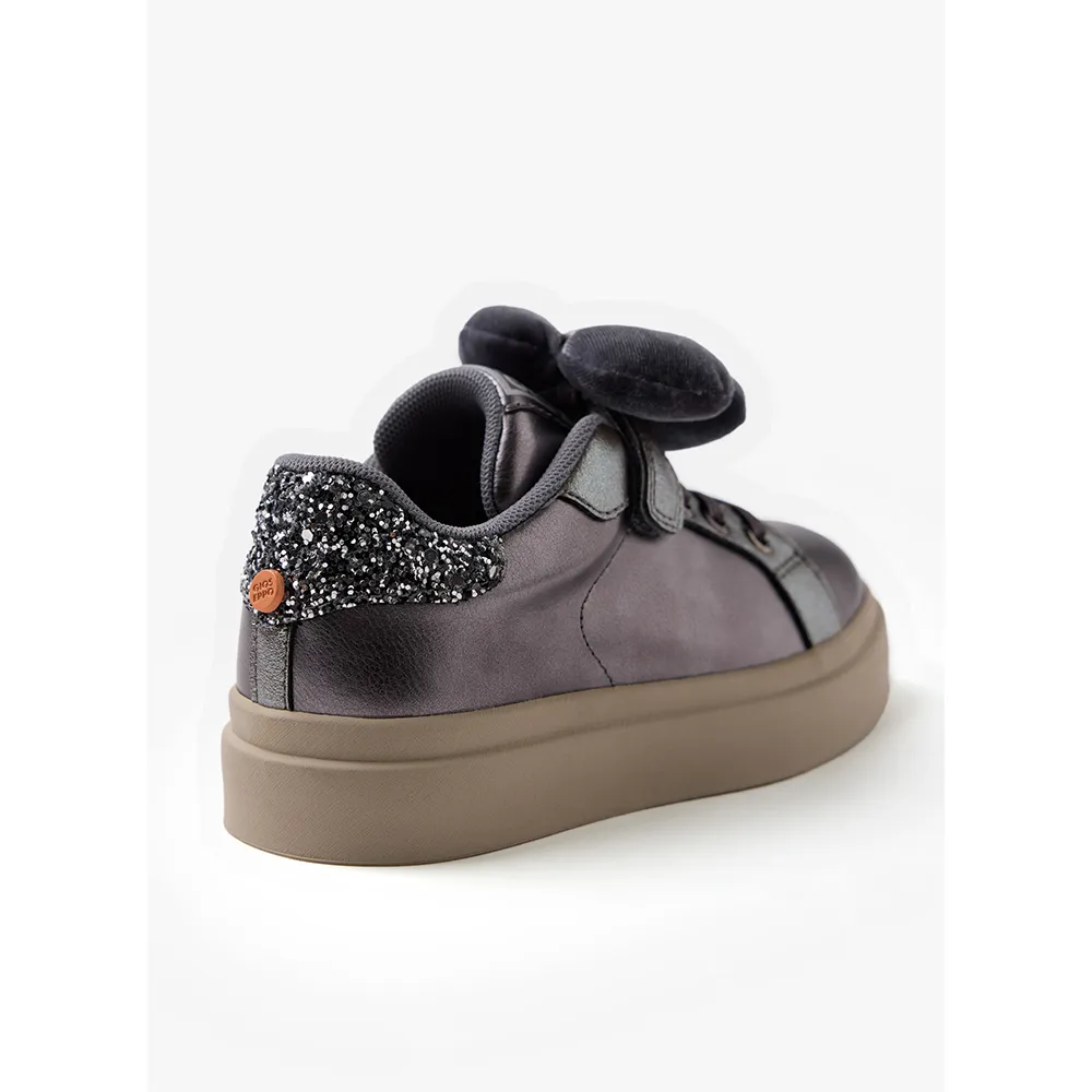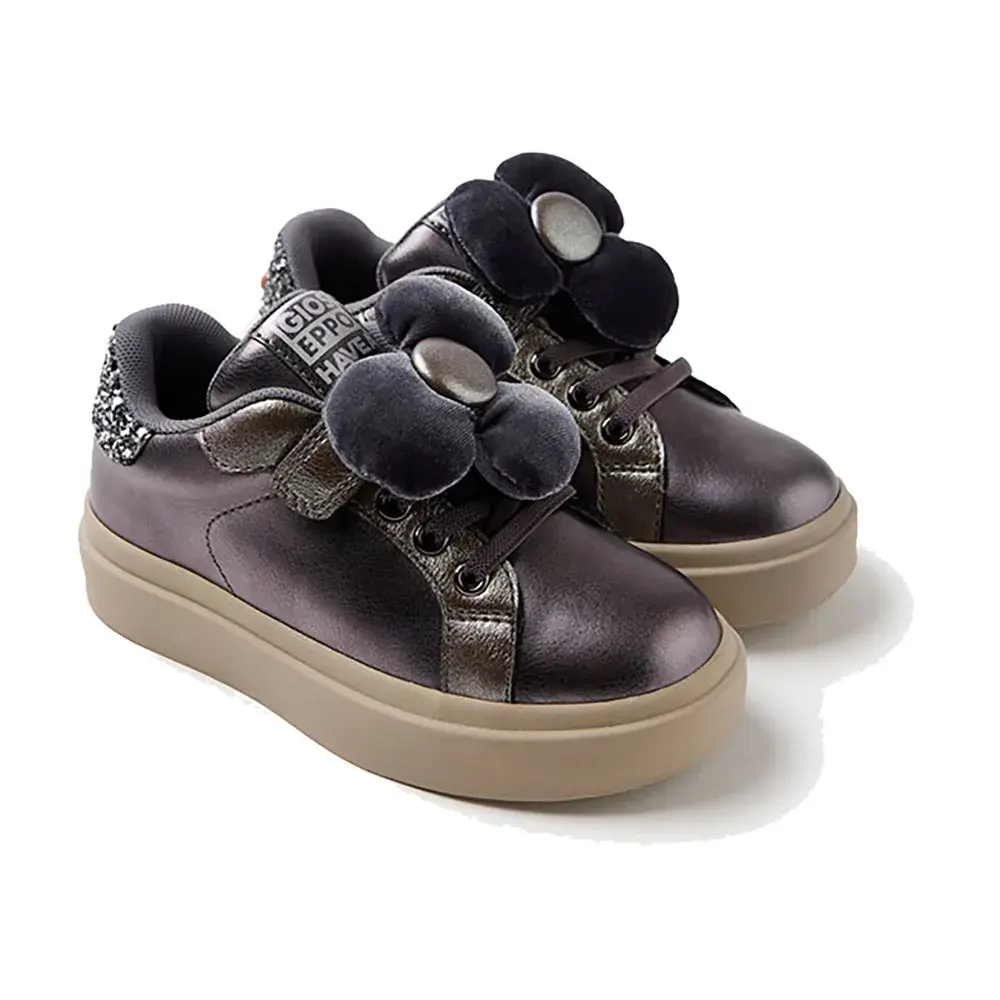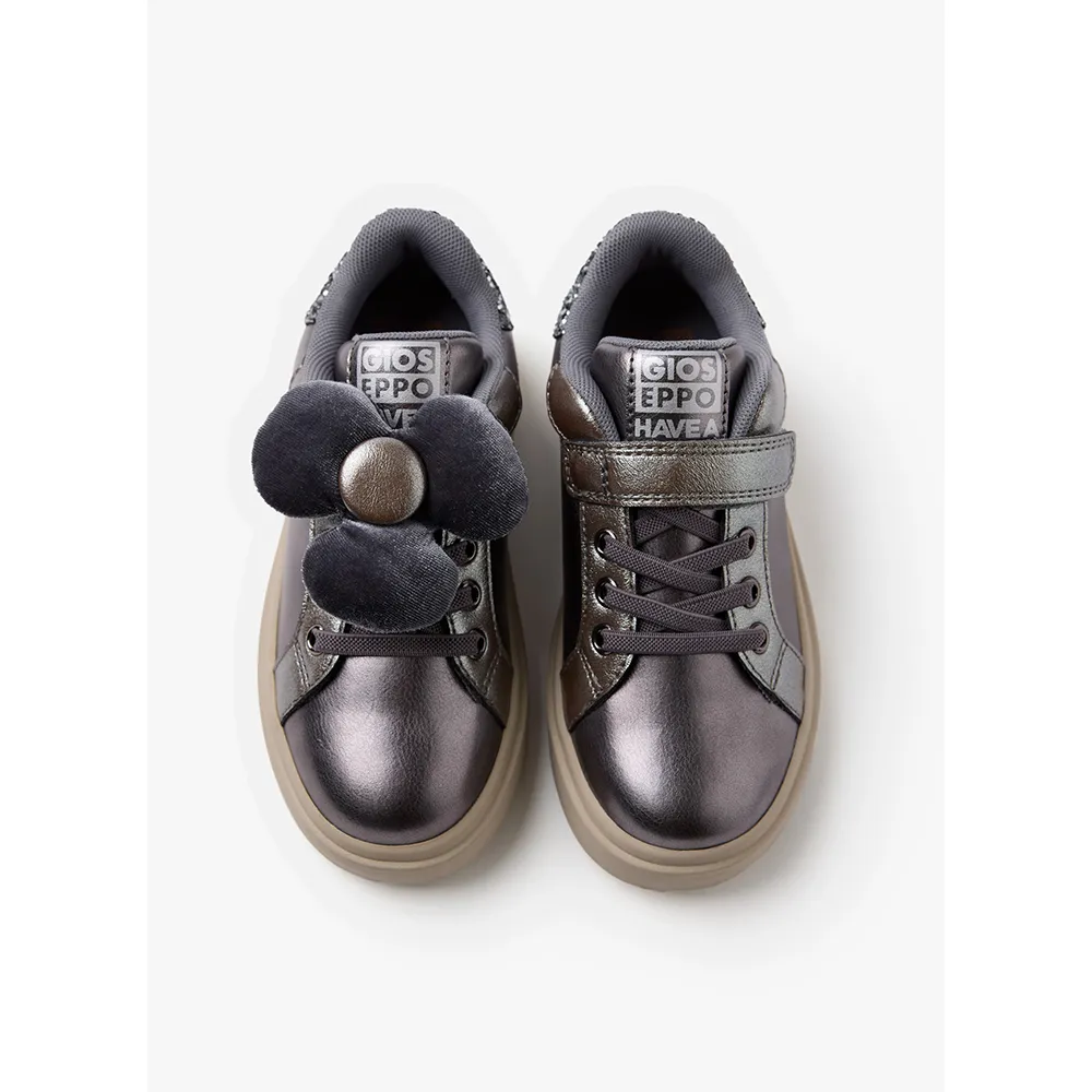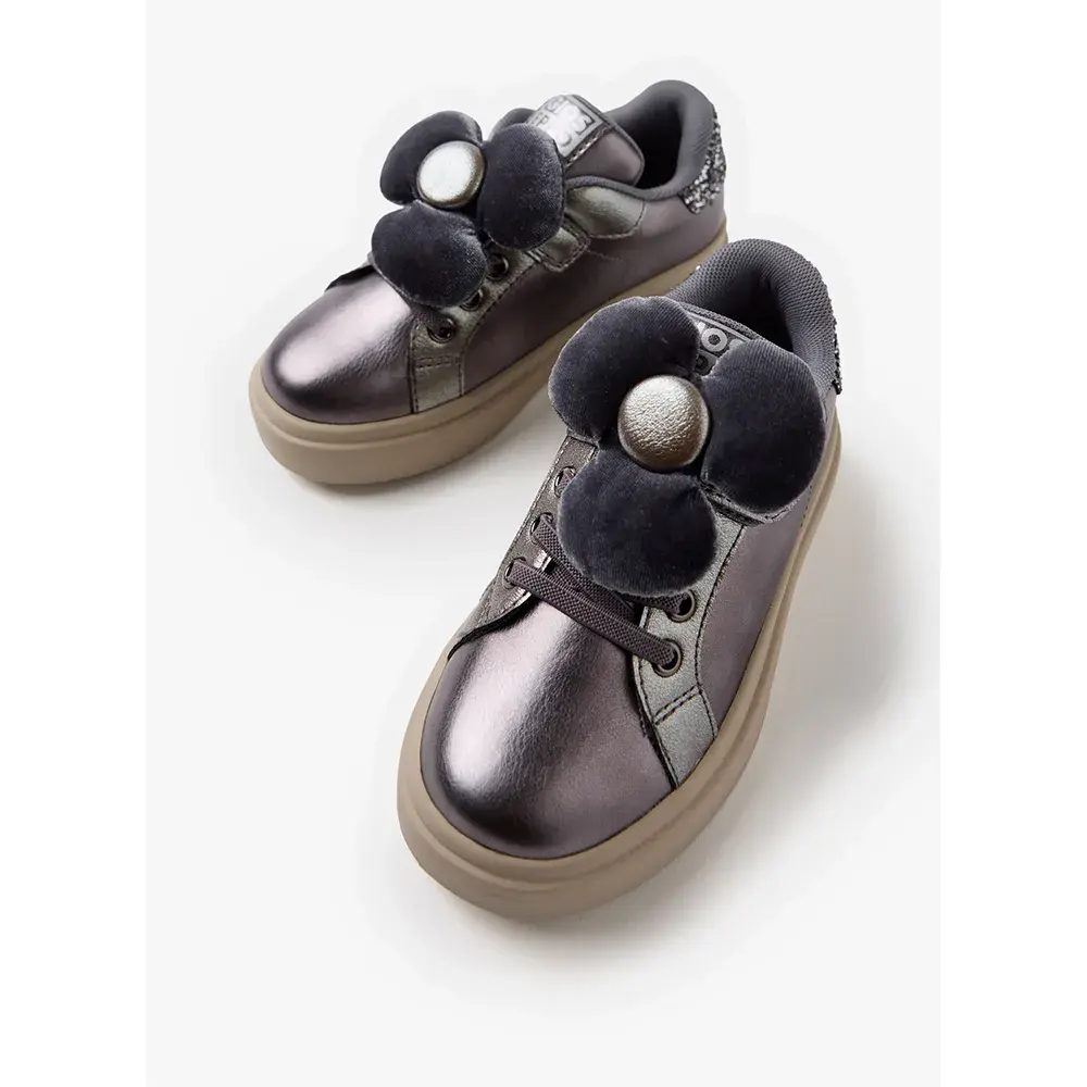 Металлические кроссовки с блестками и съемным цветком.