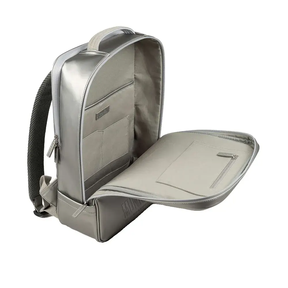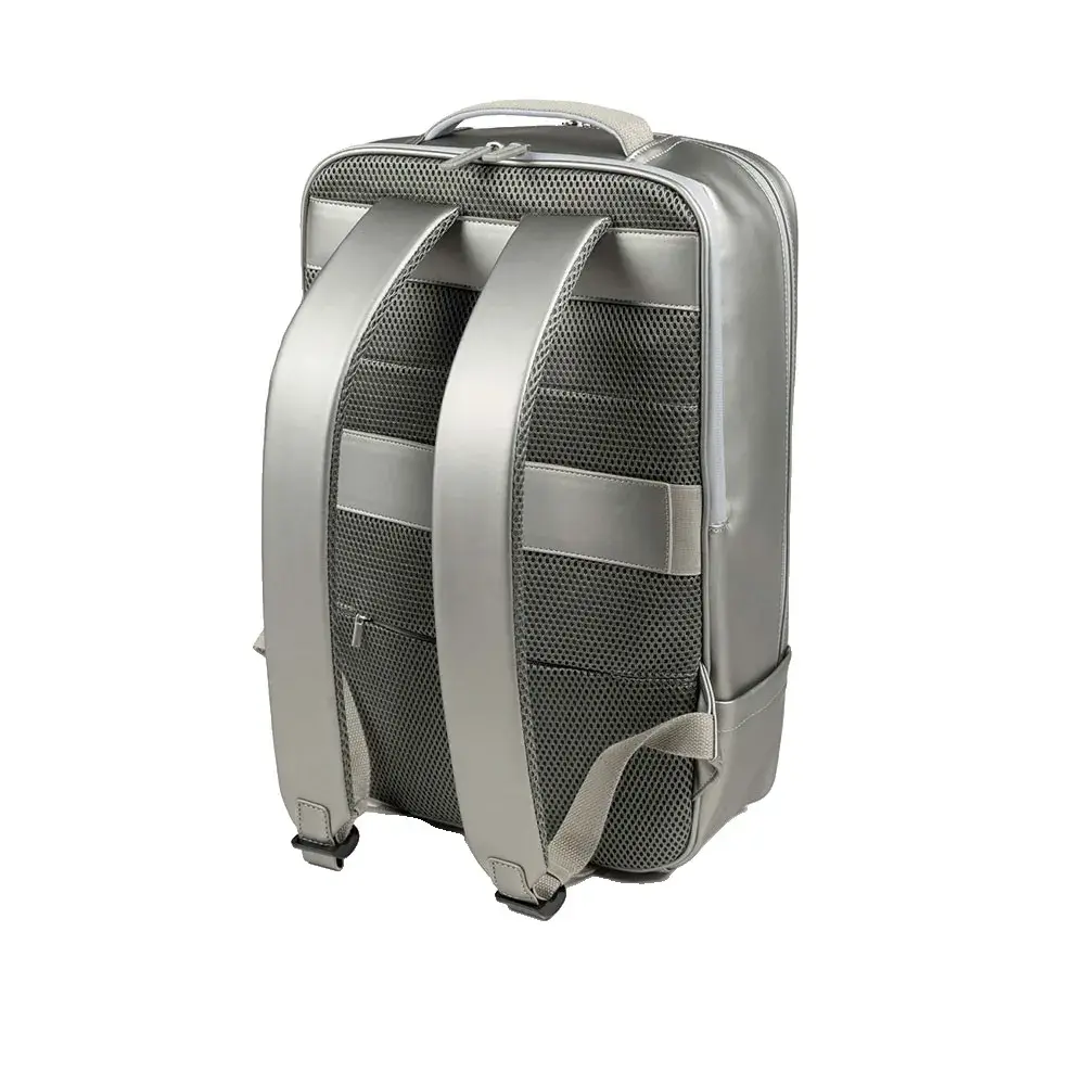 Рюкзак в минималистичном стиле, изготовленный из полиуретана, полученного из переработанных пластиковых бутылок. Водостойкий материал и застежка-молния. Двойное отделение на молнии и потайной передний карман. В заднее отделение помещается ноутбук размером 16 дюймов. Мягкие и регулируемые плечевые ремни. Мягкая и дышащая спинка с ремешком для крепления к чемодану. Внутренний карман на молнии.
