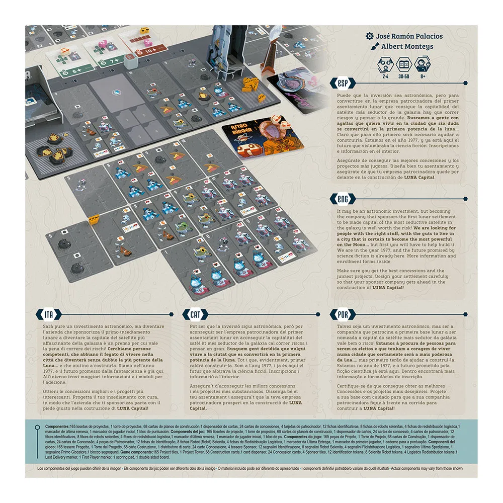 Кроме того, недавно сформированный лунный орган по санкционированию присвоит статус satellite capital лучшему из представленных проектов, так что награды будут вдвойне приятными! Luna Capital - игра ДжозефаГ Рамина Паласиоса (La ViГ ± a), уже известного автора, который своим вторым изданием предлагает нам очень интересный опыт как для опытных игроков, так и для тех, кто только начинает свой путь в мире современных настольных игр.
