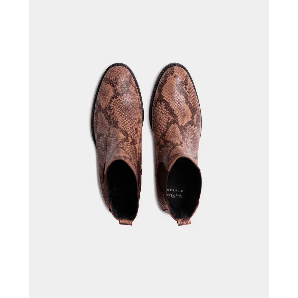 Эти женские ботильоны выполнены из кожи, имитирующей змею, и дополнены эластичными лентами того же тона.