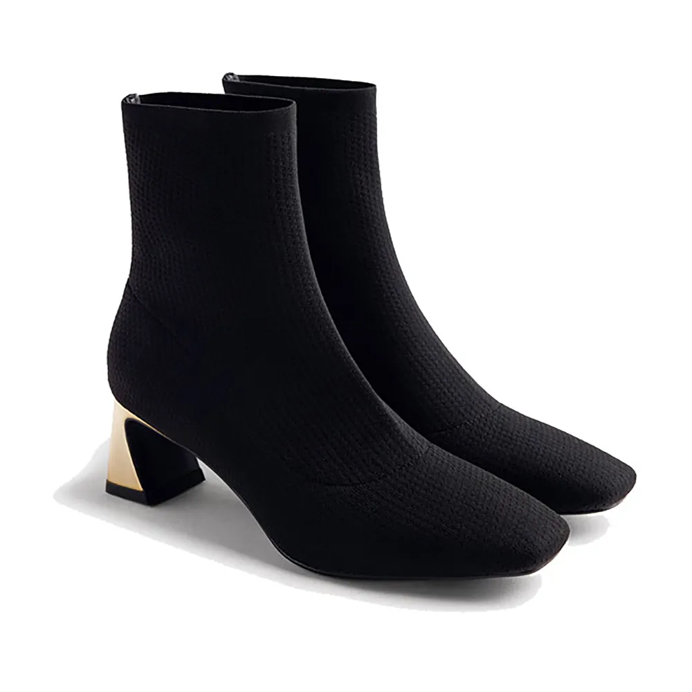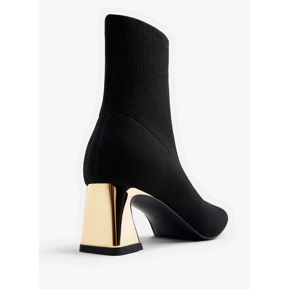 Скульптурный каблук с металлической отделкой и квадратный носок.