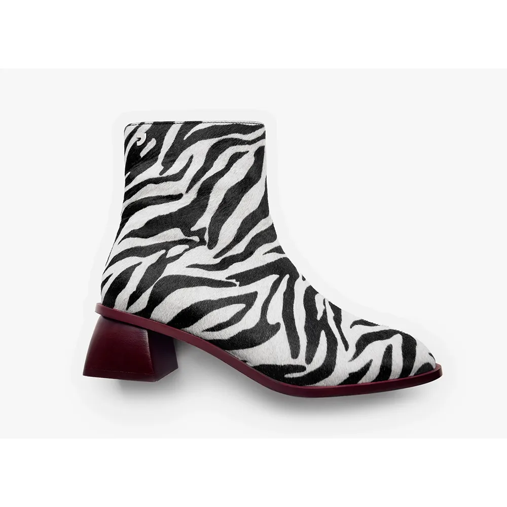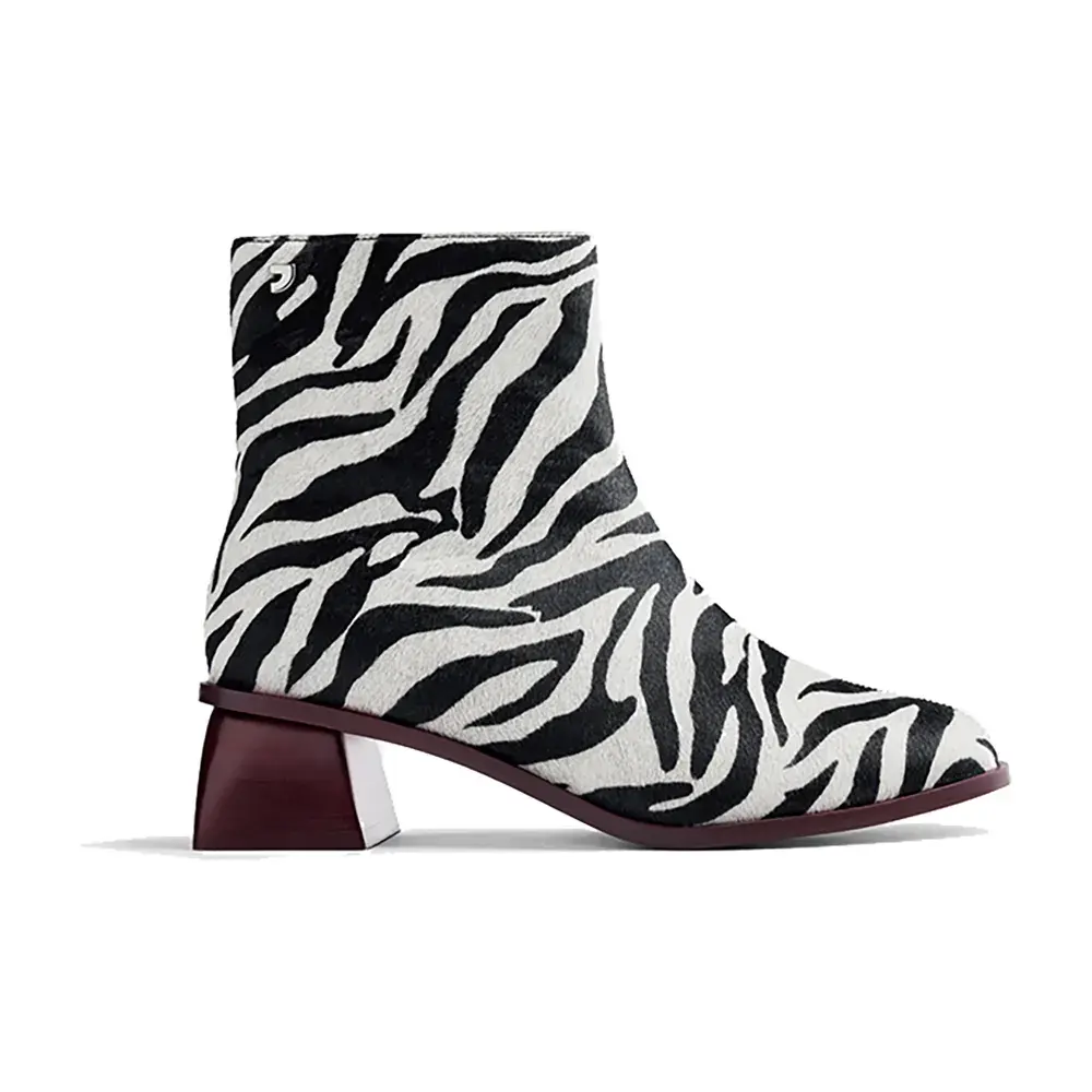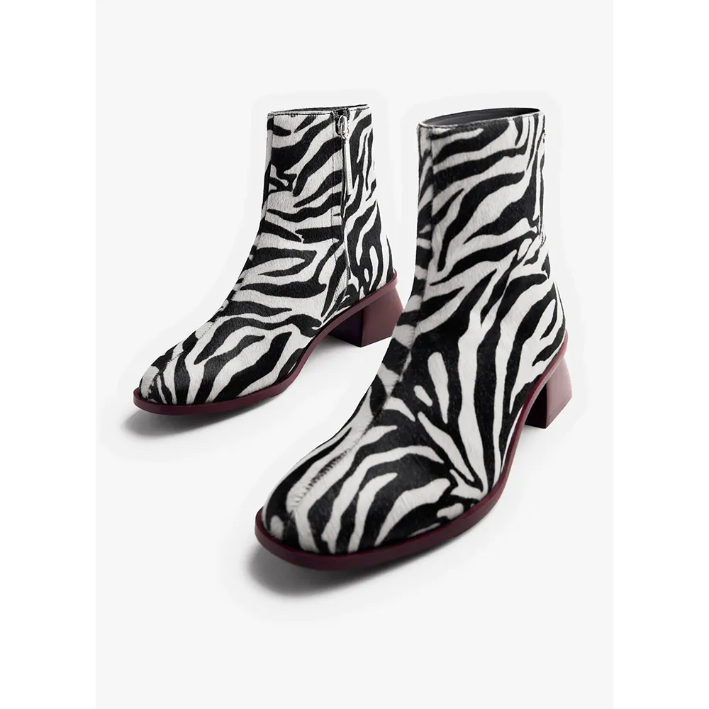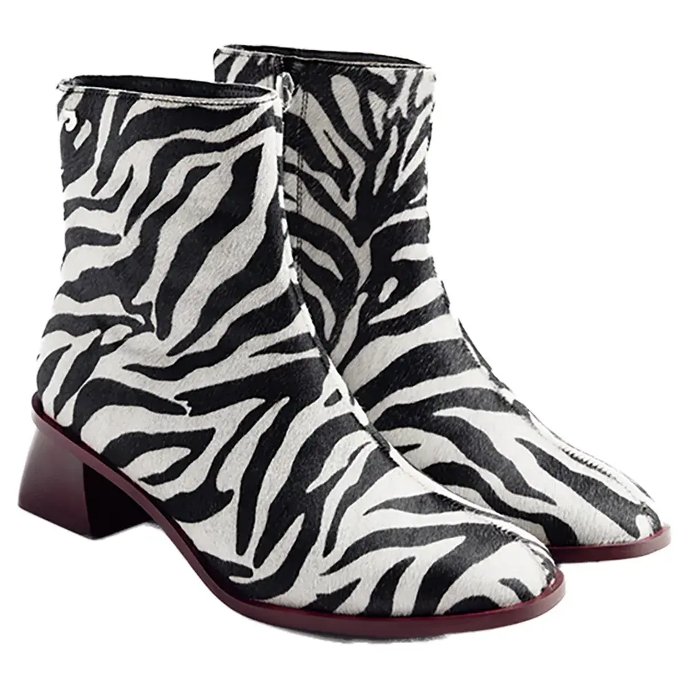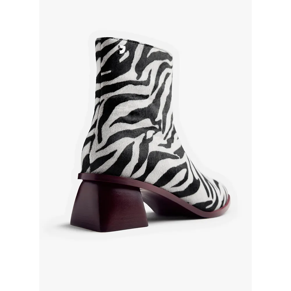 Ботильоны из меховой кожи с принтом в виде зебры, скульптурным каблуком и контрастной отделкой.
