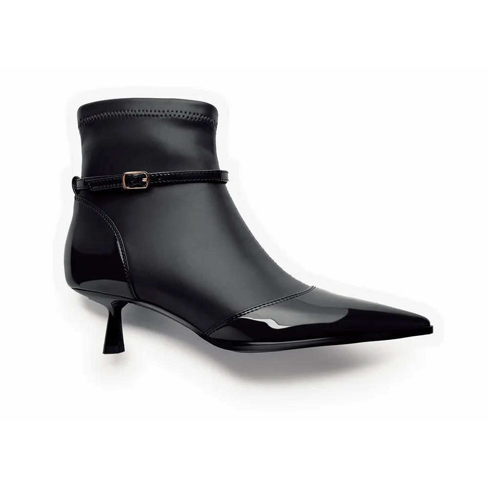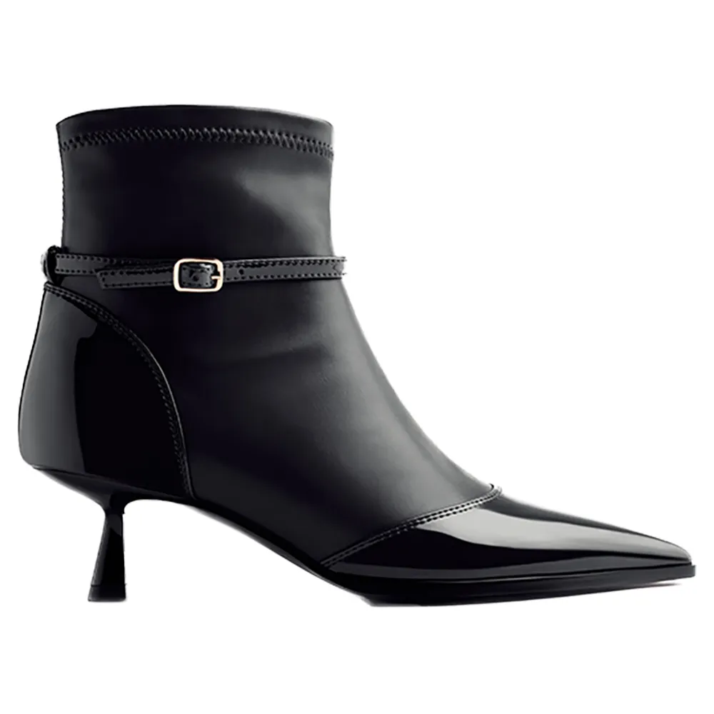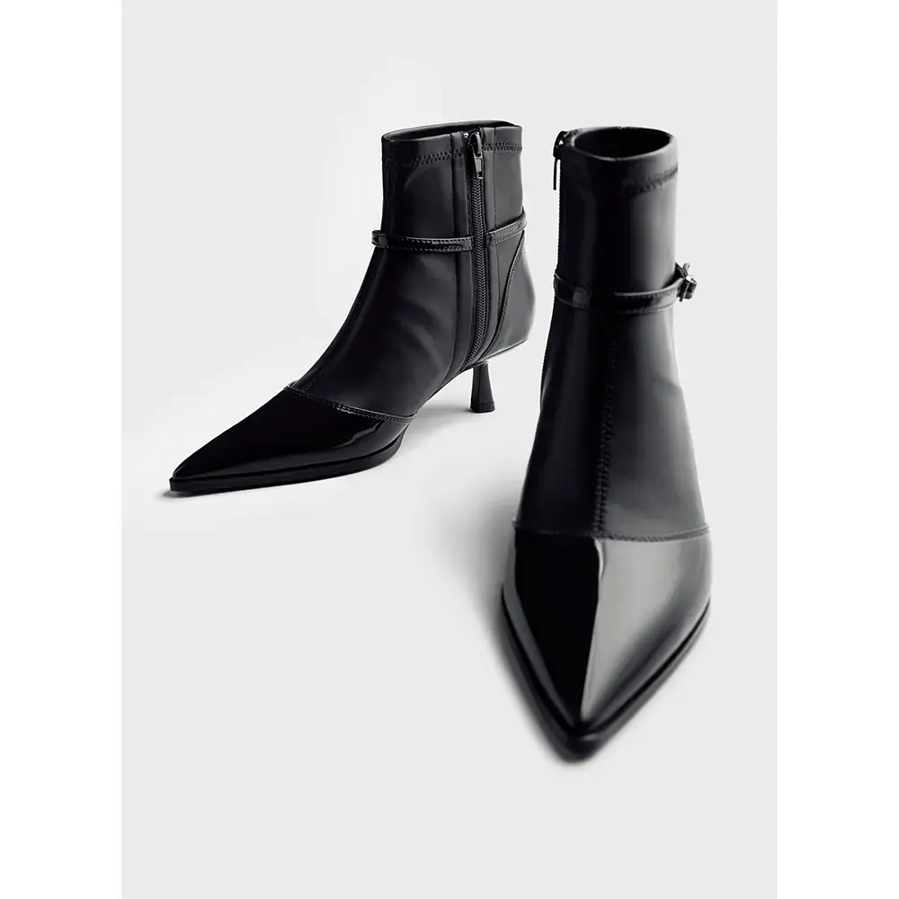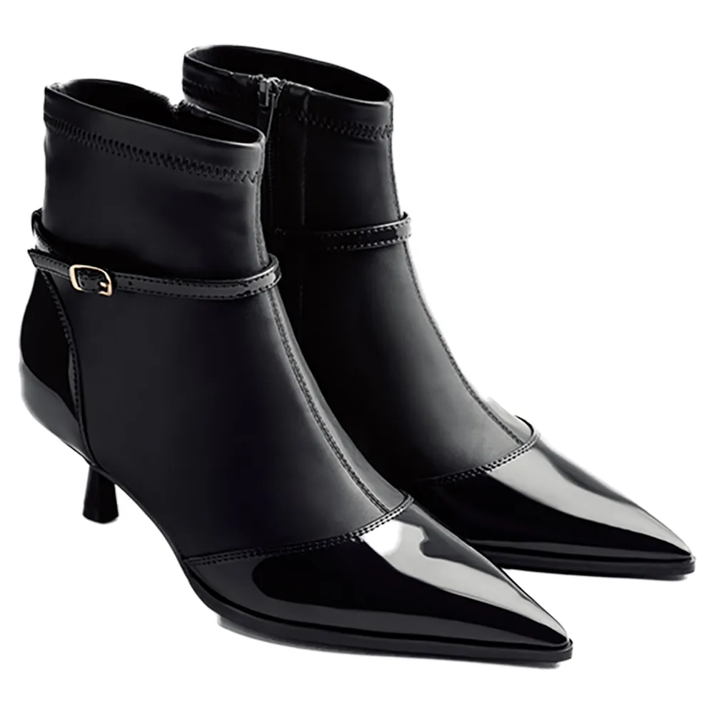 Заостренный носок, вставки из лакированной кожи и ремешок на щиколотке.