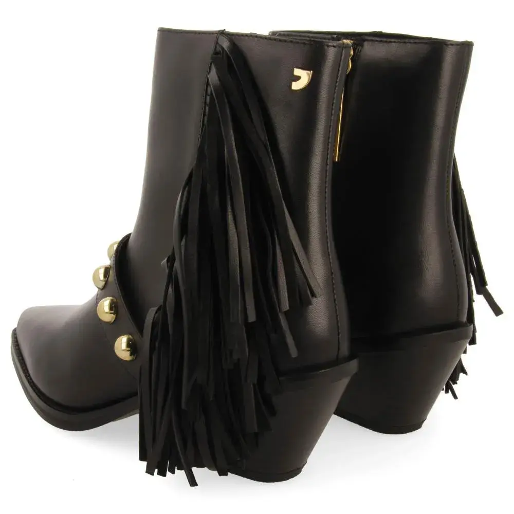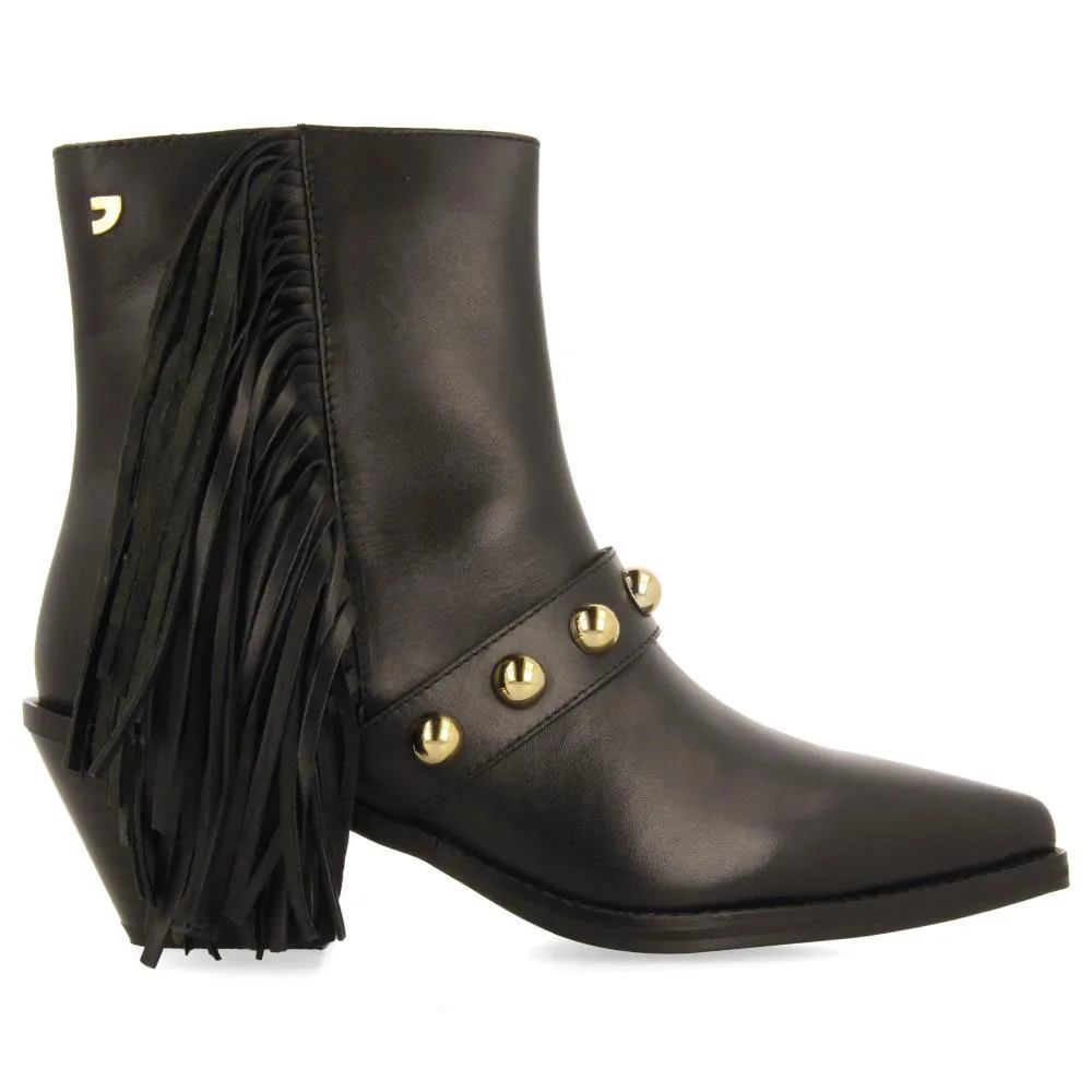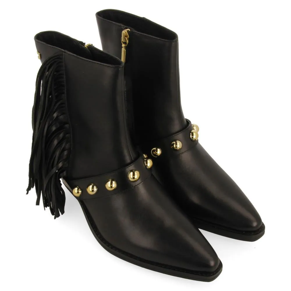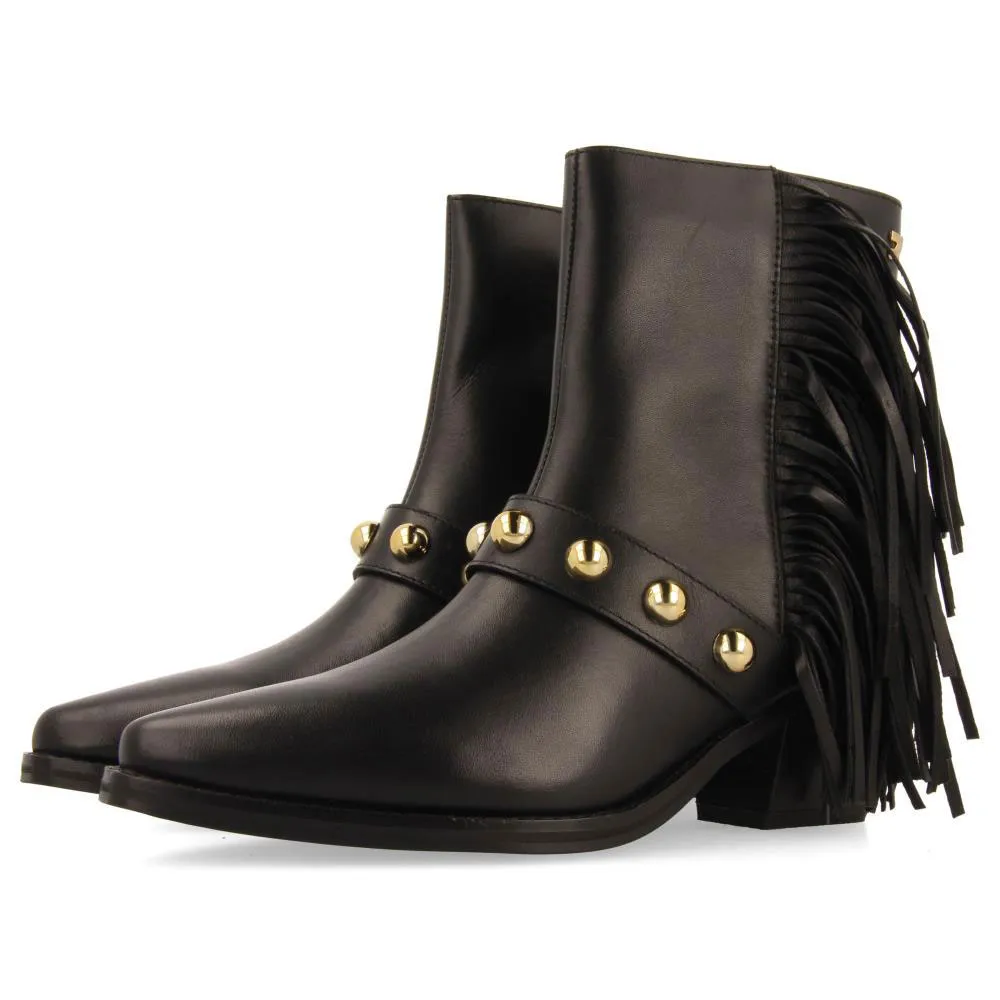 Кожаные ботильоны на каблуке с бахромой и заклепками.