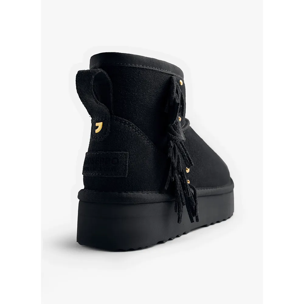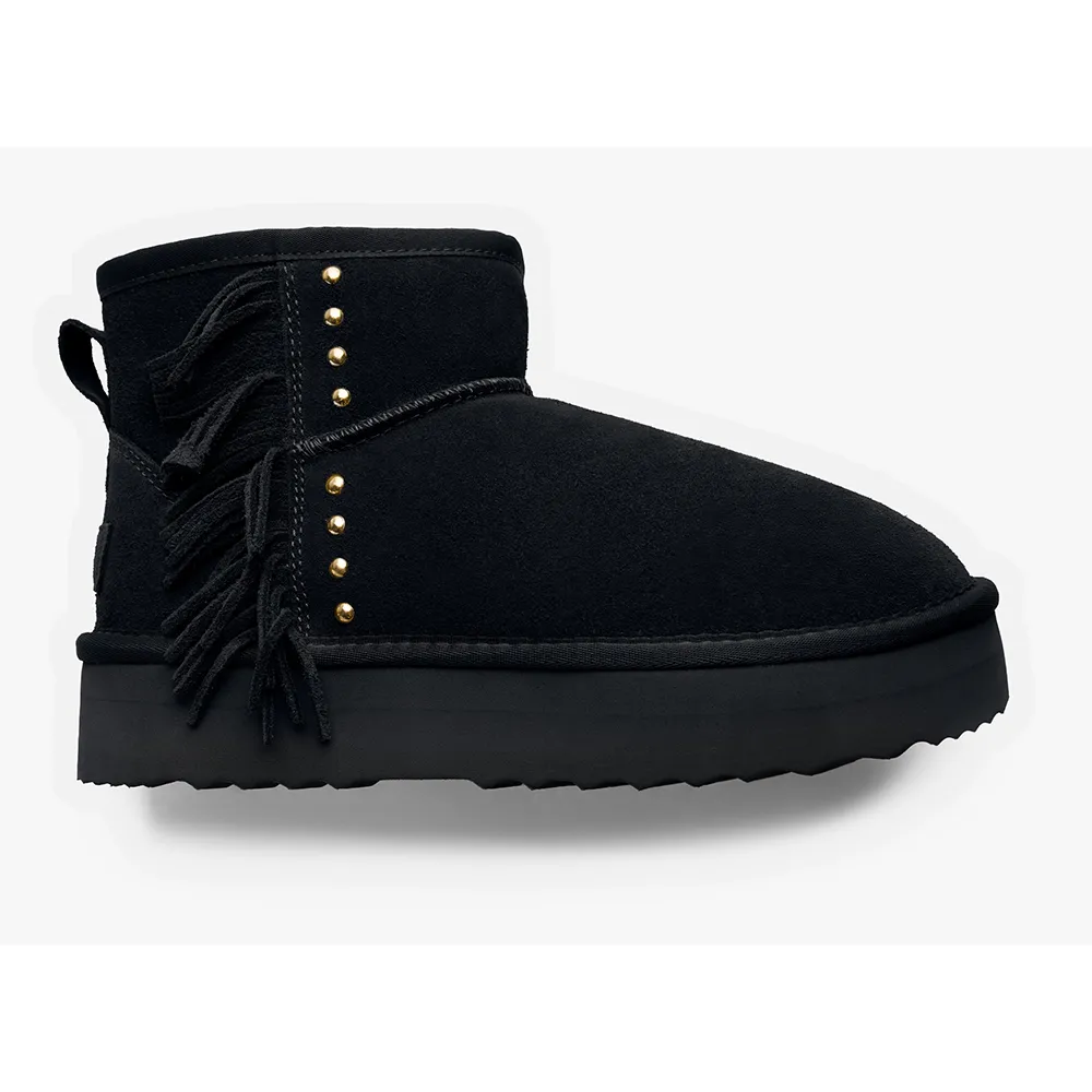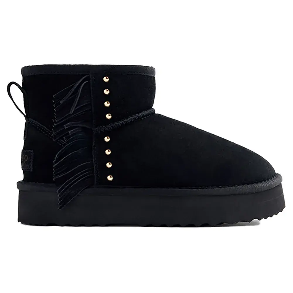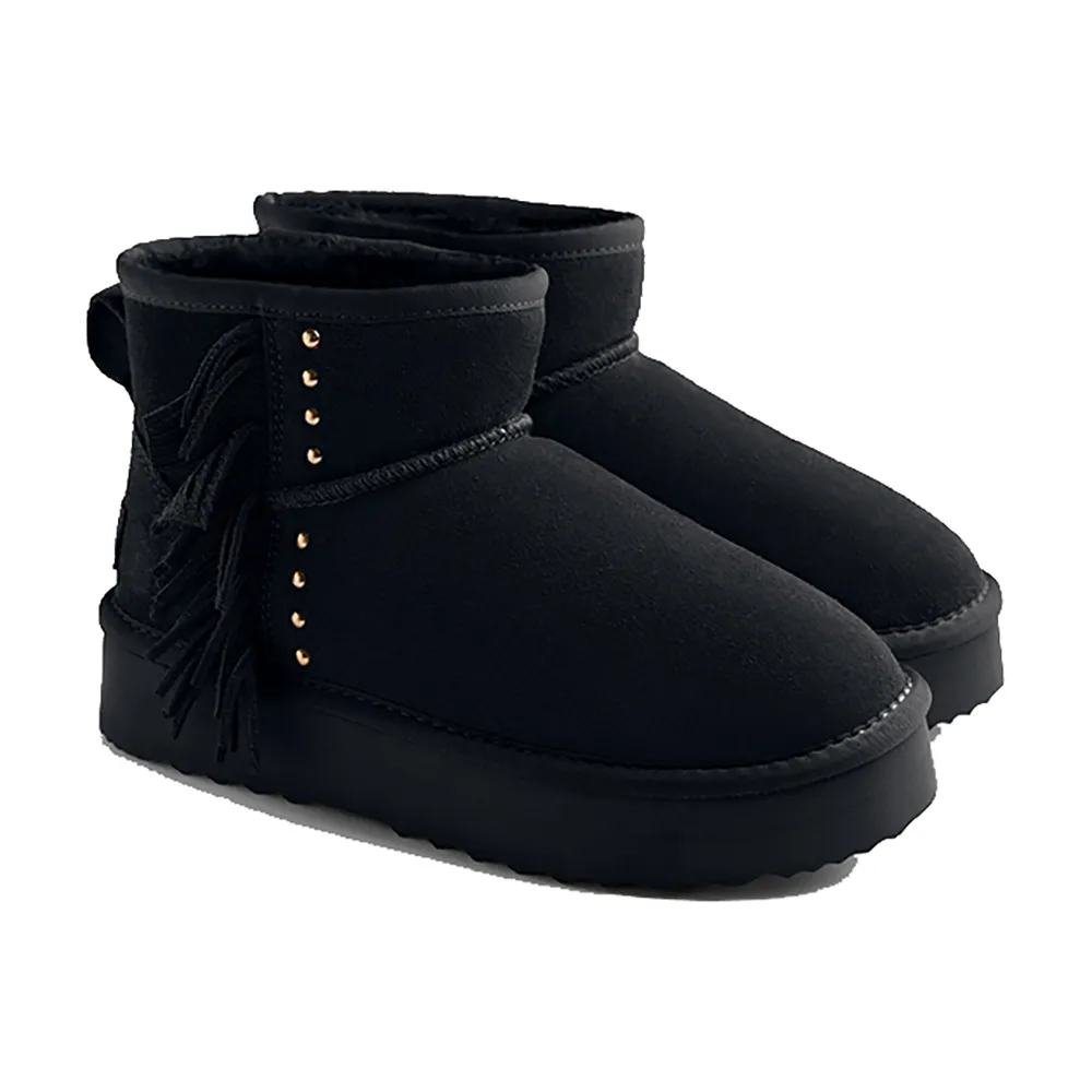 Замшевые ботинки в австралийском стиле с бахромой, золотыми заклепками и платформой.