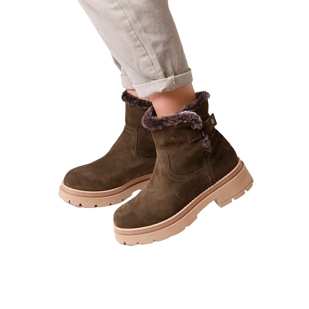 Эти женские ботильоны изготовлены из замши с подкладкой из мягкого синтетического меха.