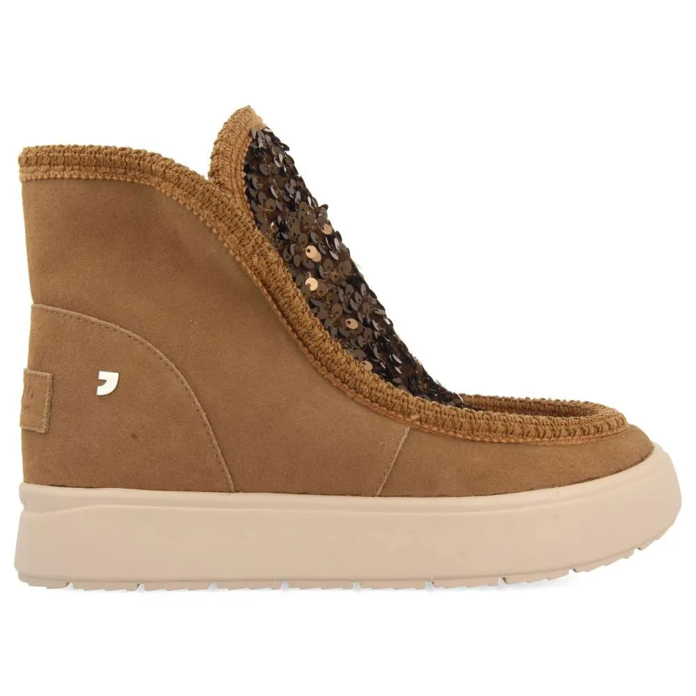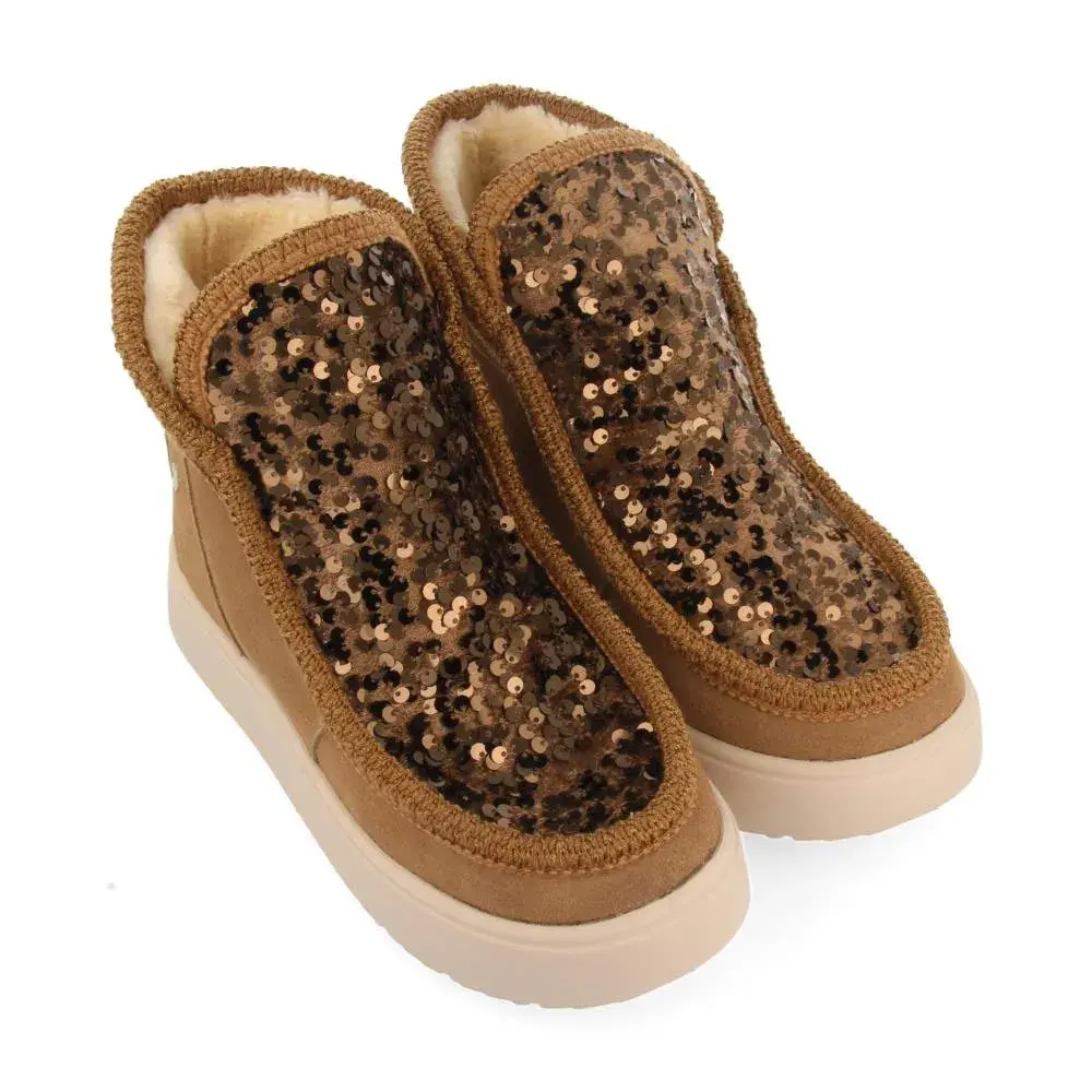 Кожаные сапоги темно-серого цвета в австралийском стиле с блестками и меховой подкладкой.