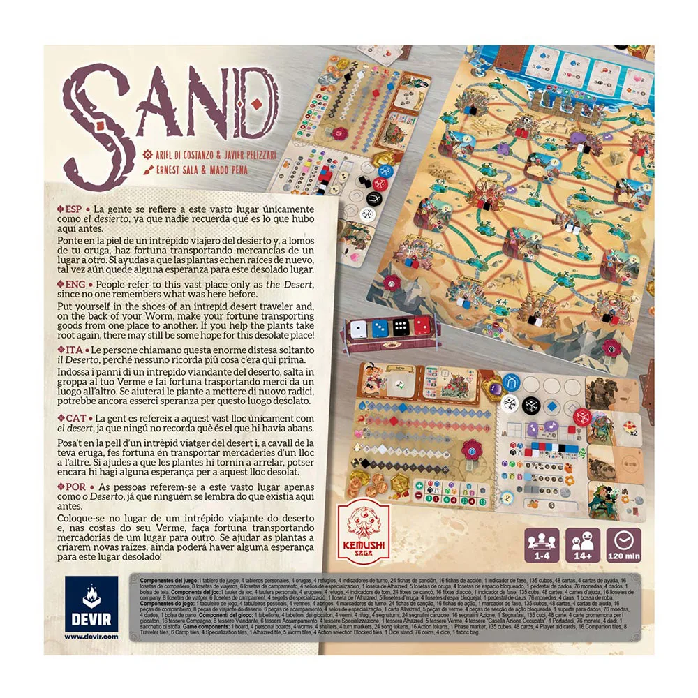 Там, где когда-то рос пышный лес, теперь лежит только песок. Обширная пустыня простирается от предгорий гор Акайши до утесов Сипо. Древние, полуразрушенные города являются домом для последних человеческих сообществ, которые борются за выживание, добывая то немногое, что осталось от зелени. Между городами бесстрашные путешественники по пустыне перевозят товары на спинах своих ценных гусениц. Хотя их единственная цель - заработать как можно больше денег, в то же время, более или менее сознательно, они помогают вернуть жизнь в пустыню, перенося маленькие растения из искусственных теплиц городов в самые отдаленные уголки этого песчаного океана. Разработанная Ариэлем Ди Костанцо и Хавьером Пелиццари и иллюстрированная Эрнестом Салой, Sand - это новое название в Kemushi saga, игре с механикой подбора и доставки, которой можно играть в одиночку или в группах до 4 игроков, начиная с 12 лет, в играх продолжительностью около 120 минут. В Sand игроки возьмут на себя роль этих бесстрашных путешественников по пустыне, путешествуя по тропинкам и кратчайшим путям на игровом поле и посещая разные города, проезжая через оазисы, лагеря и большой порт. Они будут собирать товары (растения, поделки, реликвии или таинственные камни ивакура), чтобы доставить их в другие места и таким образом заработать золото за транспортные услуги. Они будут пересекать дюны на спинах гигантских гусениц, о которых они должны хорошо заботиться, чтобы те выросли сильными и могли более эффективно выполнять поставленные задачи. По пути они найдут компаньонов с полезными навыками, которые облегчат им работу. И на протяжении всей игры им будут даваться миссии, выполнение которых принесет им значительные выгоды в конце путешествия. Но обитатели пустыни живут не только за счет золота. В Sand вы также можете совершать молитвы, чтобы изменить результаты выпадения кубика, получить престиж (который даст вам дополнительное золото при доставке товаров) или сочинять песни в городах, что даст вам бонус при доставке товаров туда. Игровая система основана на механике "забрать и доставить", что означает "забрать и доставить". На протяжении всей игры игроки будут загружать товары в разных точках карты и доставлять их другим после совершения поездки. Чем больше поставок будет успешно завершено, тем больше золота они получат и тем больше у них будет шансов выиграть игру. Это кажется простым, не так ли? Для выполнения различных действий у каждого игрока будет по четыре цветных жетона действия, которые соответствуют каждому из четырех игровых кубиков. Жетоны действия обозначают время, которое они тратят на выполнение действий. В игре используются различные игровые действия (и будьте осторожны, время ограничено!). В зависимости от цвета кубики ассоциируются с различными жетонами действий и используются для определения силы действий, которые могут быть выполнены. Всем этим также можно насладиться в продуманном одиночном режиме, который имеет 3 различных уровня сложности. Готовы ли вы столкнуться с трудностями пустыни на спине вашего любимого caterpillar? Вы хотите открыть для себя следующую часть вселенной Kemushi saga, сеттинг таких замечательных игр, как Bitoku или Bamboo? Раскройте весь потенциал песка и помогите растениям снова пустить корни, чтобы жизнь и надежда могли снова прорасти в безлюдной пустыне.