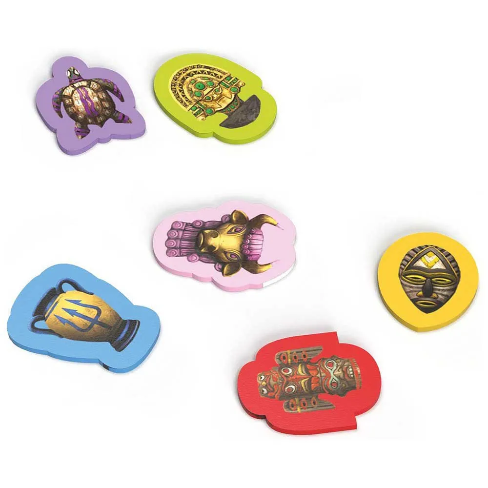 1 Правила, 1 Доска для подсчета очков, 6 двусторонних досок об археологических раскопках, 159 карточек, 54 транспортных средства (по 9 в каждой из 6 форм и цветов), 6 жетонов игроков, 1 Рамка ботаника, 1 Доска лингвиста, 36 жетонов реликвий (по 6 в каждой), 6 музейных досок, 6 жетонов профессора.