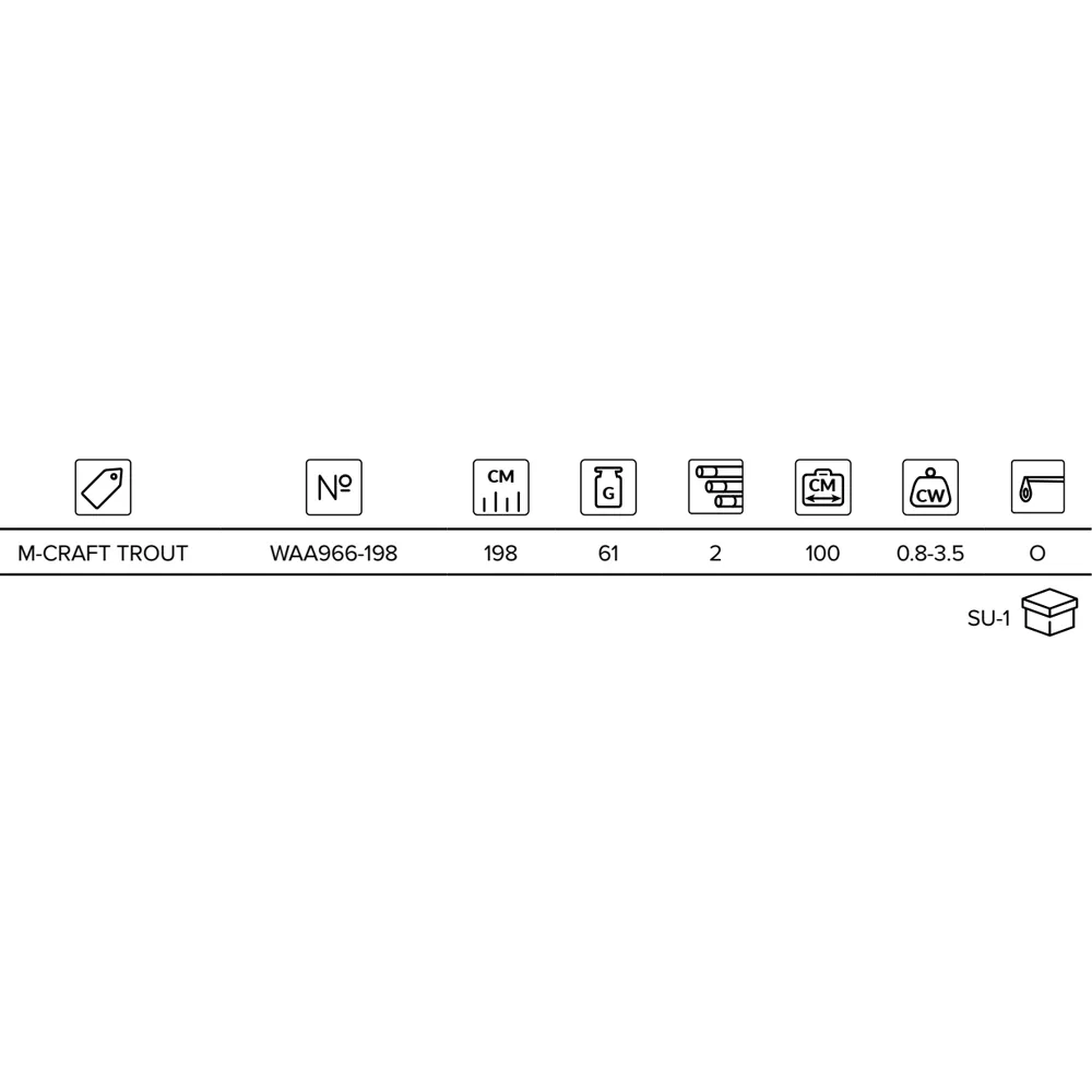 Trout - самое прочное удилище в серии M-Craft. Предназначено для ловли форели на небольшие блесны и вращающиеся блесны. Глубокий параболический прогиб при проводке гарантирует высокую эффективность даже при ловле на безбородочные крючки.