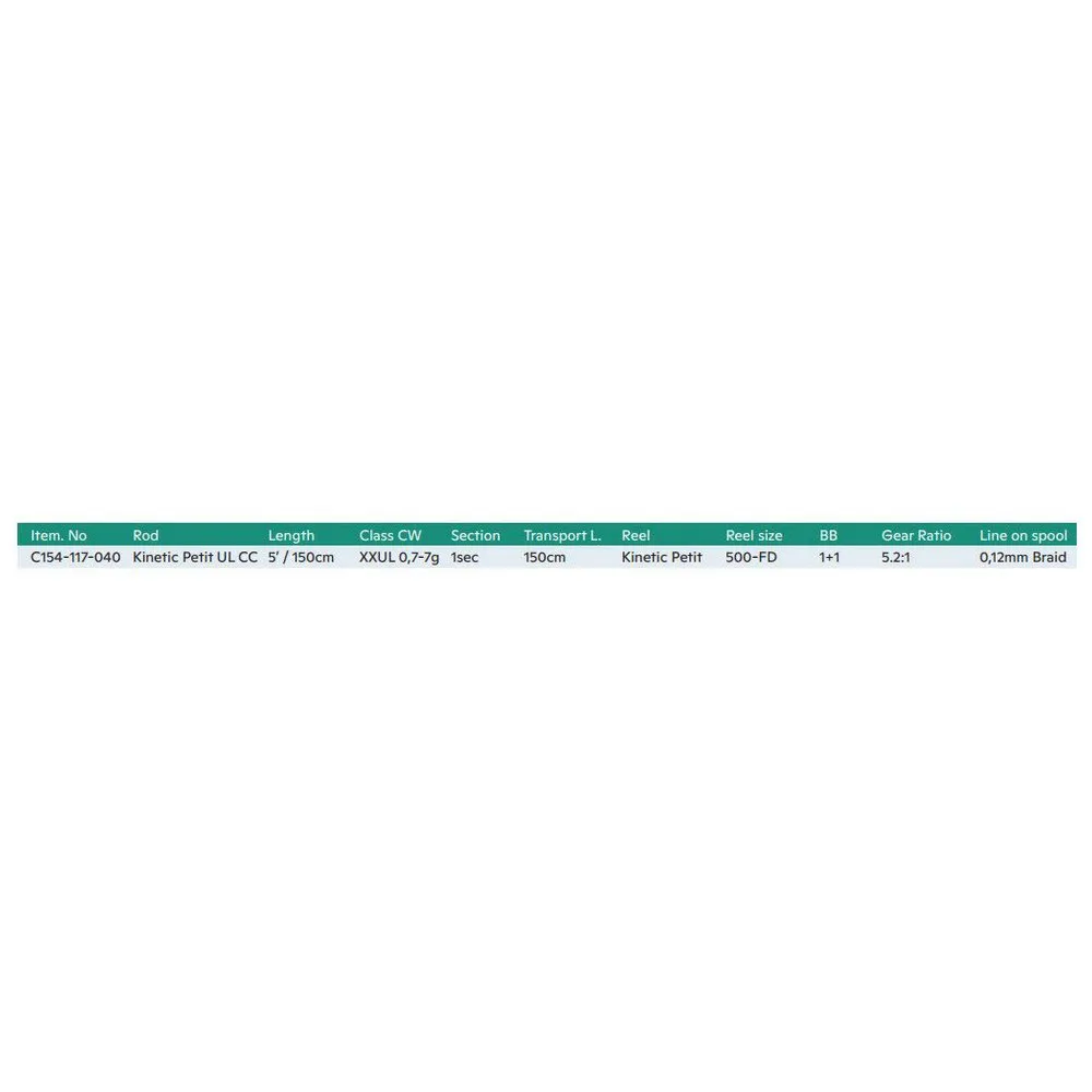 Если вы предпочитаете ультралайт, выбирайте комплект Kinetic Petit Ul CC. Этот компактный комплект удилища и катушки с легким управлением отлично справится с ловлей окуня или форели. Безынерционная катушка Kinetic Petit FD имеет компактный графитовый корпус и легкую алюминиевую шпулю. Прецизионная литая шестерня обеспечивает необходимую прочность для вываживания крупной рыбы. Плавная система с тремя подшипниками и многопозиционным антиреверсом. Удилище Kinetic Petit Ul CC идеально подходит для любителей активного отдыха. Изготовлено на основе цельного сверхлегкого трубчатого бланка из стекловолокна длиной 5 футов, оснащено кольцами SIC и удобными ручками из вспененного этиленвинилацетата.