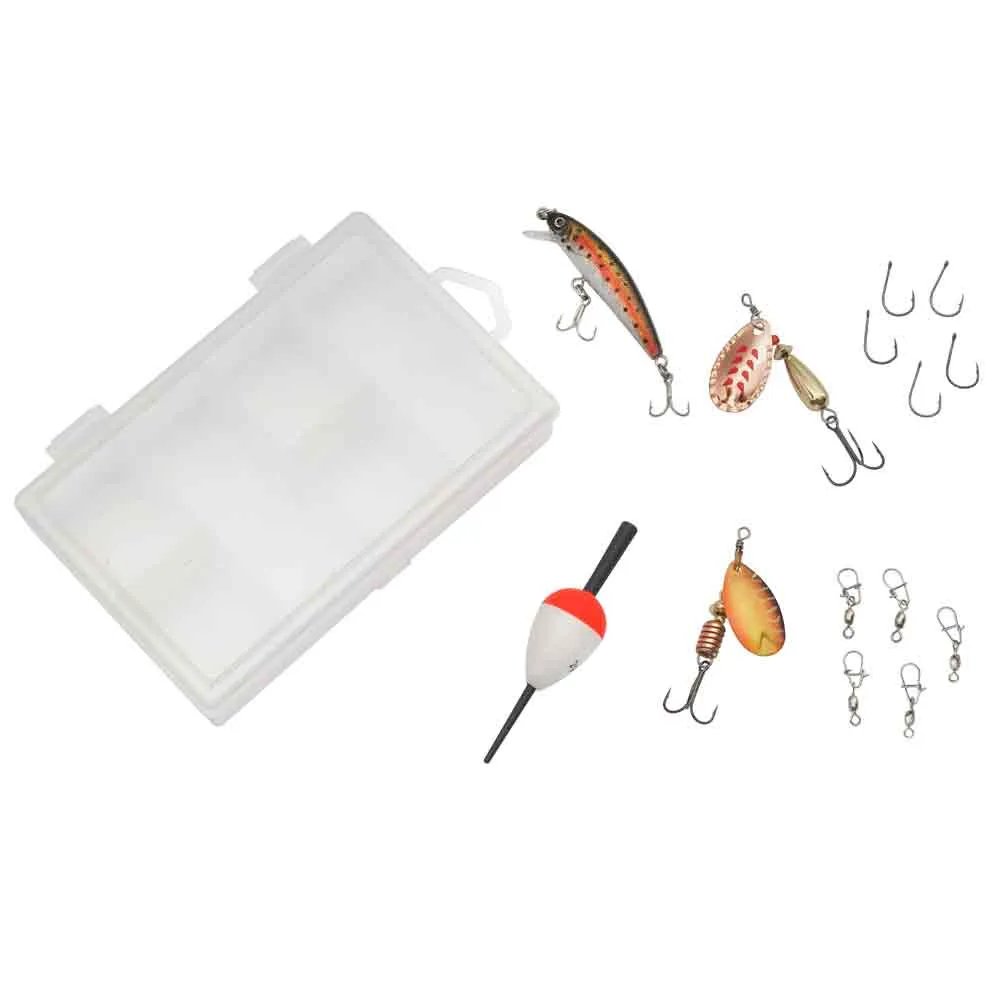 - В комплекте коробка для снастей с 3 приманками, поплавком, крючками и вертлюжками