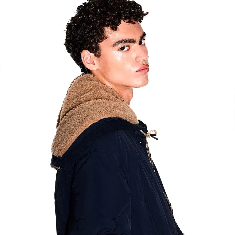 Стеганая парка с капюшоном на молнии, застежка-молния на капюшоне, плюшевая подкладка, завязки, детали из ромбовидной стегки и вставки в смешанной технике.