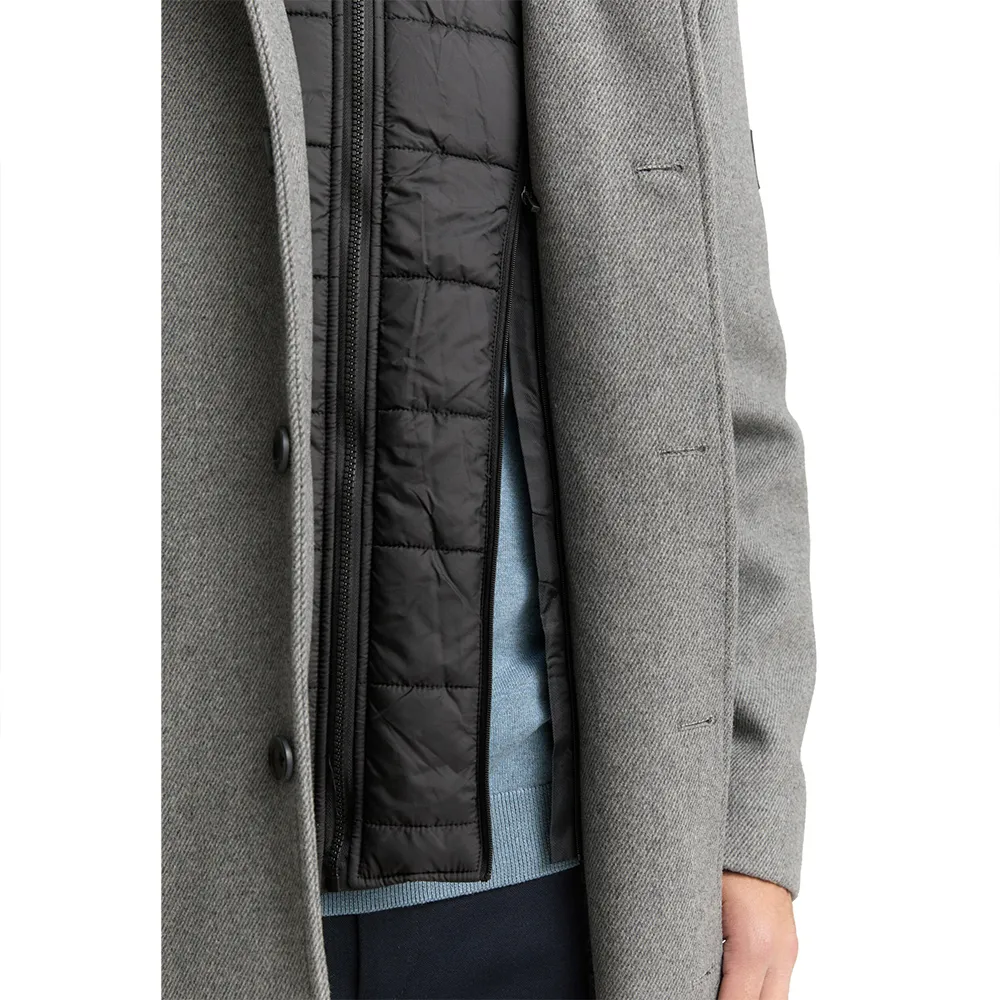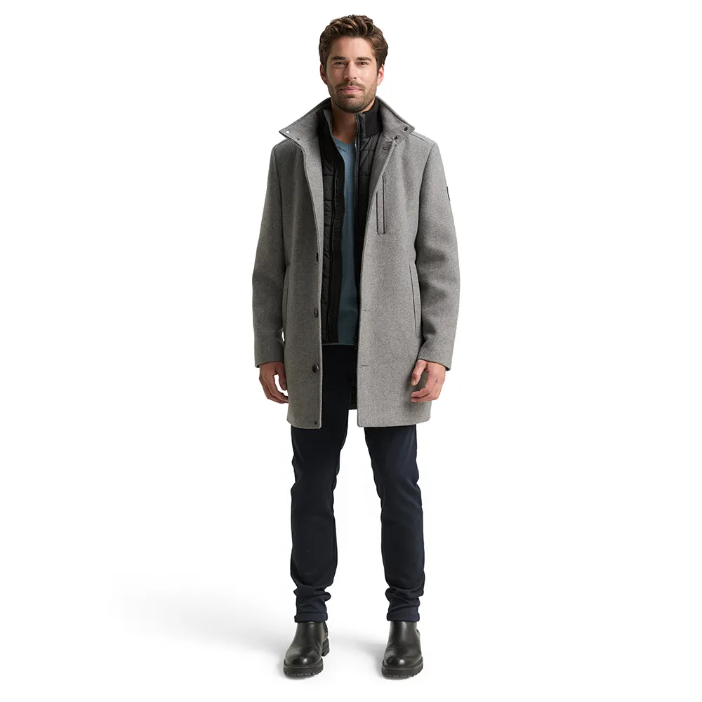 Шерстяное пальто 2 в 1 со значком с логотипом на рукаве и съемной стеганой курткой внутри для защиты от ветра и холода.