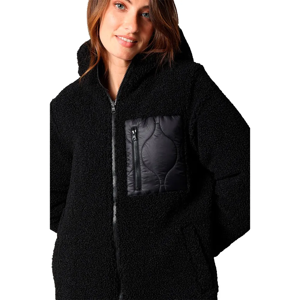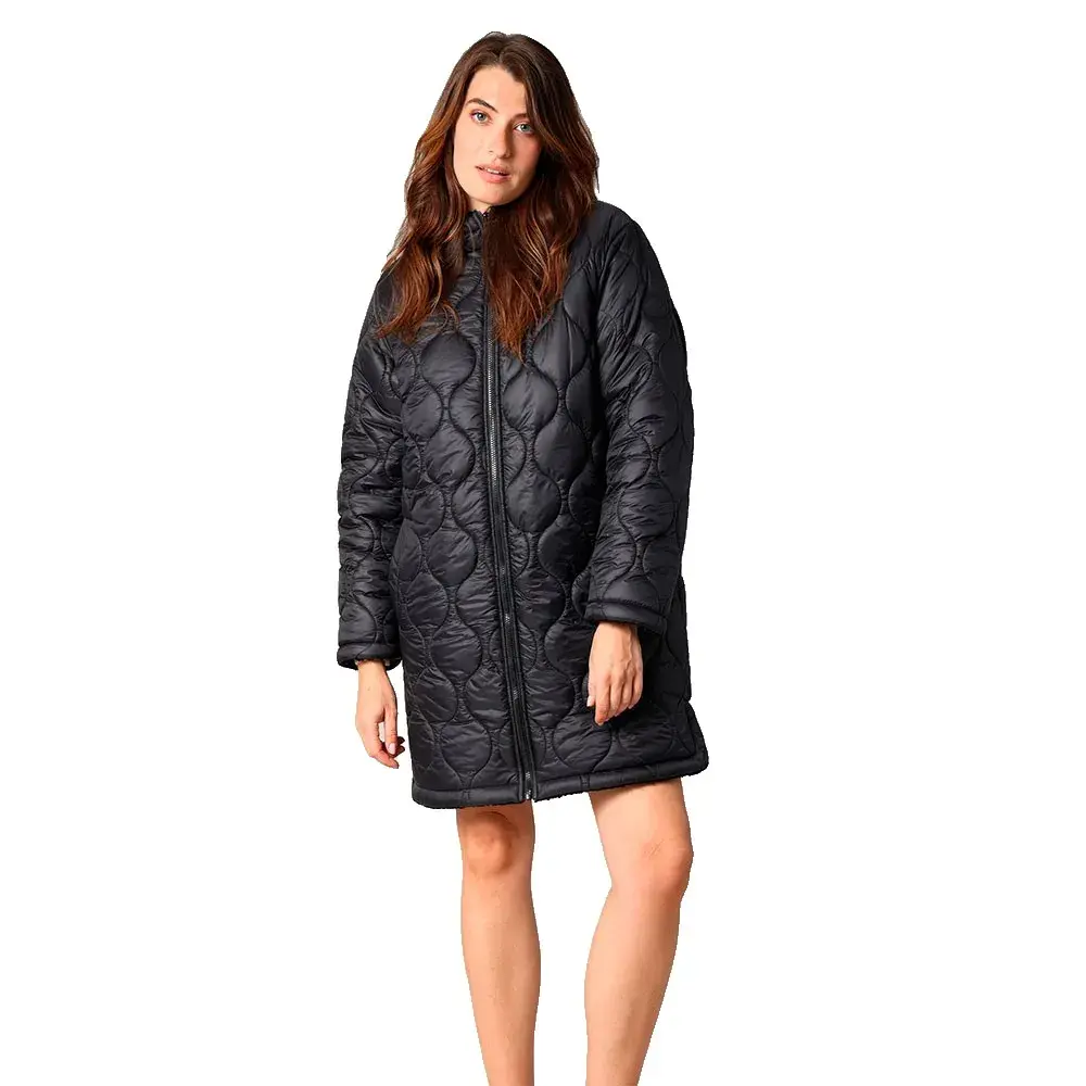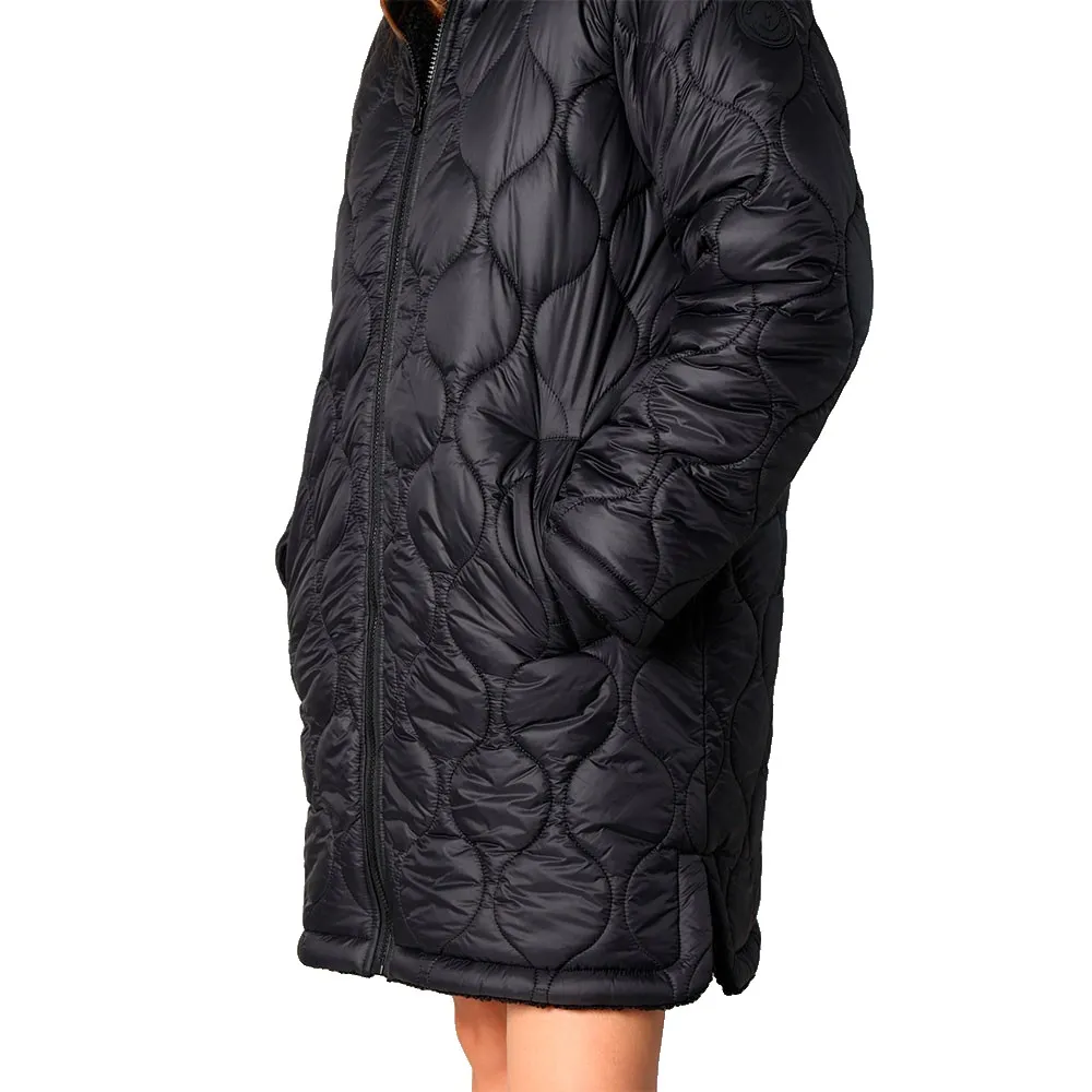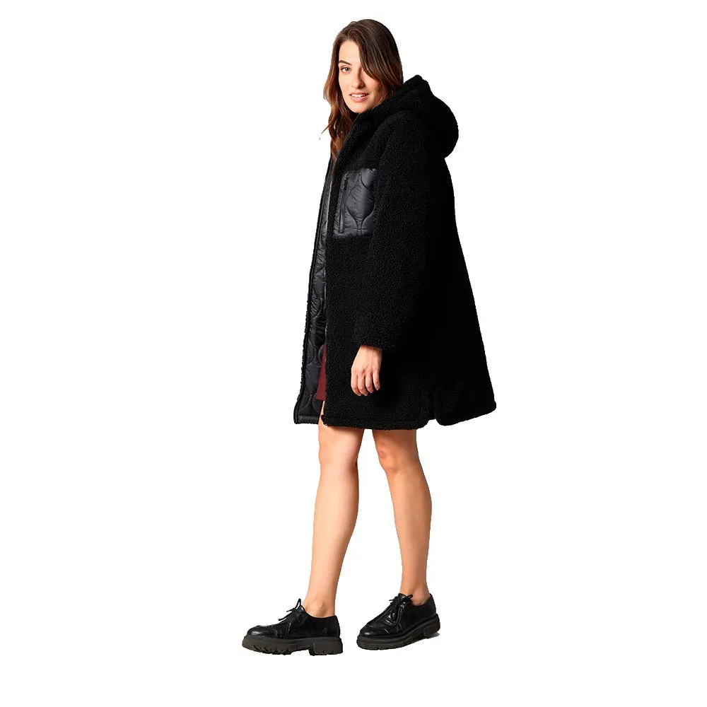 Это двустороннее пальто смело играет на контрастах: одна сторона из мягкой и пушистой шерп-ткани для уютных дней, а другая - из блестящей стеганой ткани для более городского и структурированного образа.