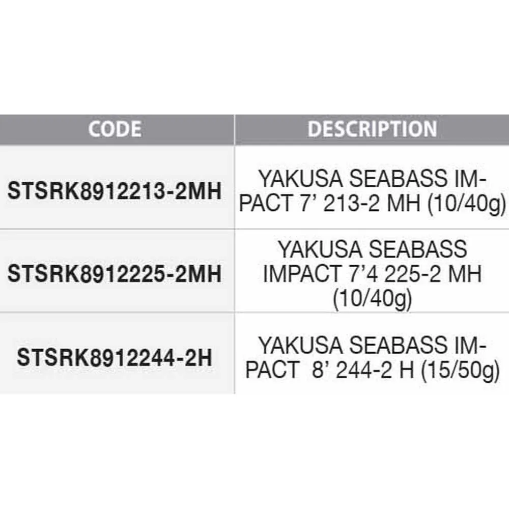 Удилища Yakusa Seabass Impact Lure имеют бланк из двух равных элементов из карбона 24T Technifibre, антишоковую рукоятку, двойную рукоятку из камуфляжной пены EVA высокой плотности, трубчатый катушкодержатель типа VSS, кольца против захлеста Seaguide, раму K Frame из SiC, гибридный наконечник и тканевый чехол.