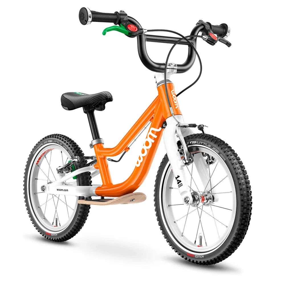 Покрышки: 14 x 1,4 дюйма Schwalbe Little Joe - Woom Edition. Высококачественные, легкие шины для хорошей амортизации, низкого сопротивления качению и максимального сцепления. Ниппели автомобильного типа позволяют накачивать шины на заправочных станциях. Светоотражающие полосы по бокам шин для максимальной видимости даже в условиях низкой освещенности