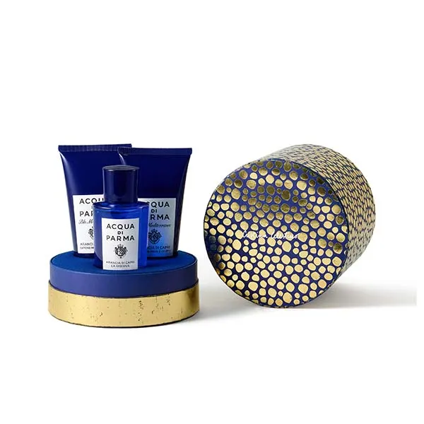 Элегантный подарочный набор из трёх предметов: парфюмерная вода Arancia di Capri La Riserva 50 мл, гель для душа и тела 75 мл и лосьон для рук и тела 75 мл . Этот набор, представленный в коробке, дизайн которой разработала Кристина Челестино, отражает смелое графическое переосмысление традиционного мастерства. Выполнен в культовом синем цвете Blu Mediterraneo, дополненном золотыми акцентами и тисненой этикеткой.