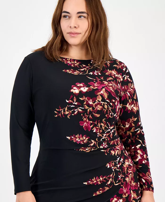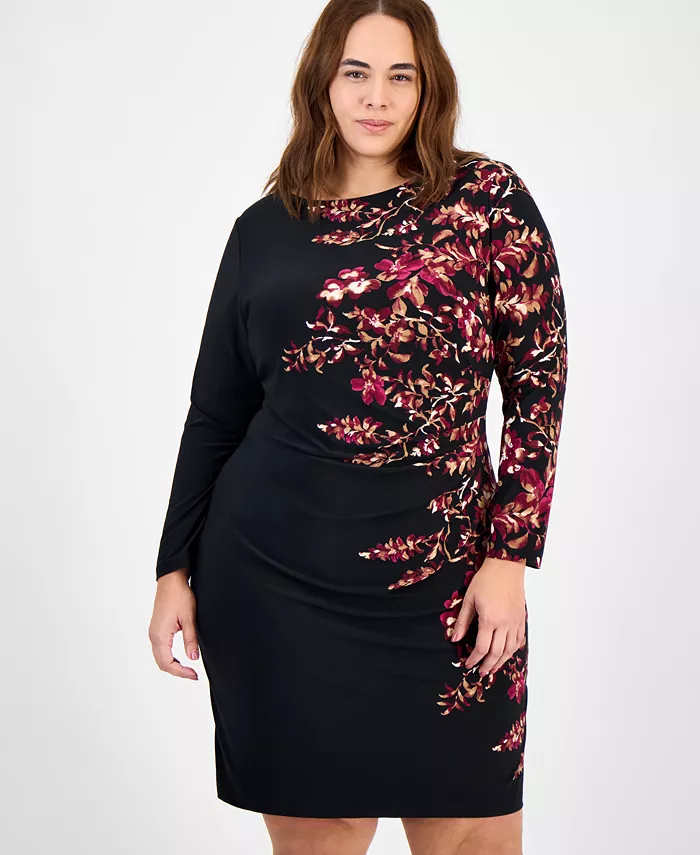 Благодаря асимметричному принту и элегантно присборенной талии вы мгновенно будете выглядеть изящно и утонченно, надев платье-футляр больших размеров от Kasper.