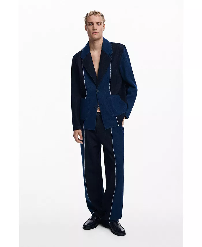 Блейзер с передними карманами, застежкой на пуговицы и комбинированной тканью с потертыми видимыми швами.