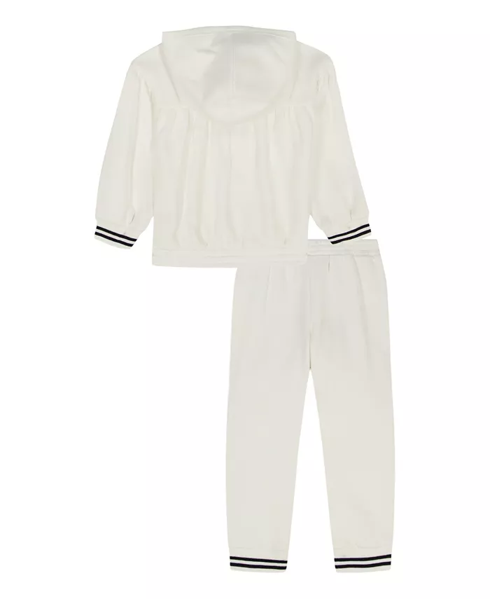 В этом уютном флисовом комплекте Tommy Hilfiger детали, вдохновленные историей, сочетаются с современным стилем. Свободный крой обеспечивает комфорт на каждый день. Верхняя часть дополнена объемным капюшоном, спущенными плечами и рукавами-буфами. Брюки-джоггеры дополнены эластичным поясом и полосатыми манжетами из рубчатой ткани для создания гармоничного образа.
