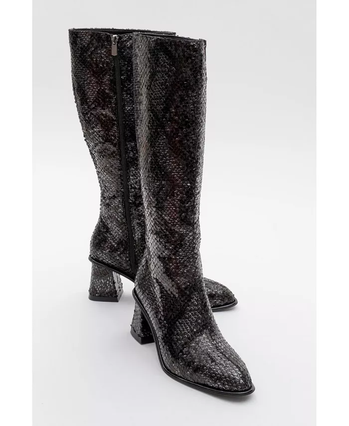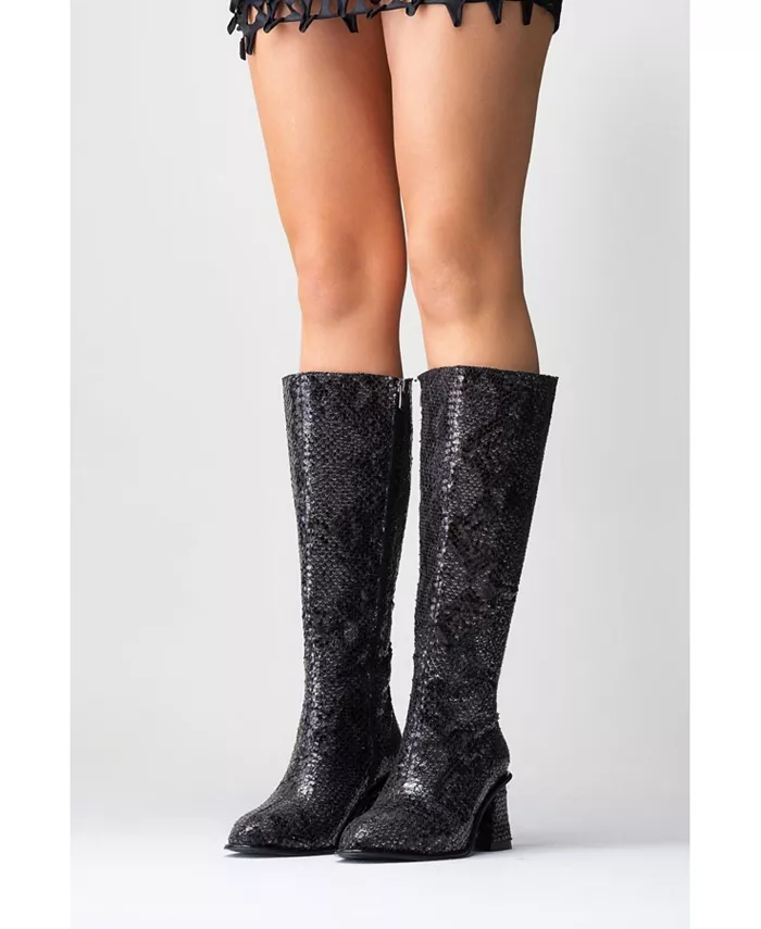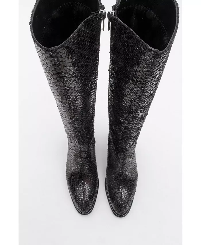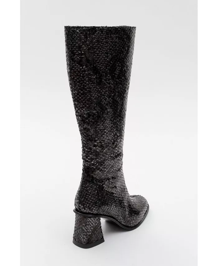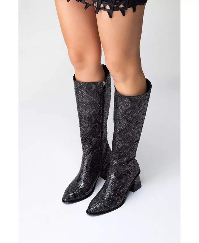 Гламурные фактурные сапоги для верховой езды с массивным каблуком и отделкой из гладкой искусственной кожи - идеальный вариант для смелого модного образа.