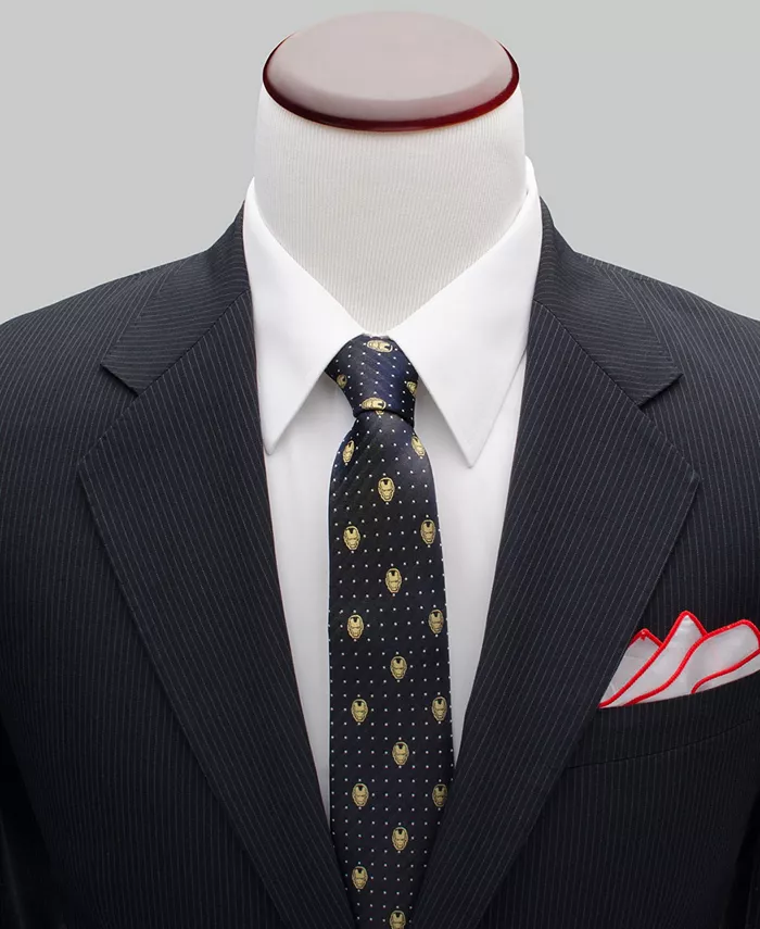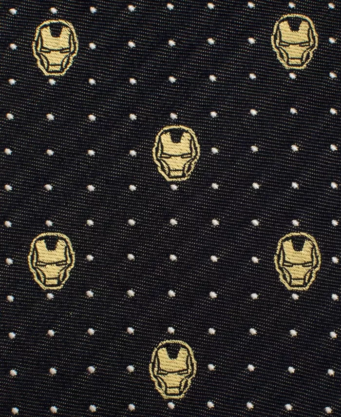Глубокий темно-синий цвет служит фоном для этого шелкового галстука. Золотистые нити, играя на свету, создают легкий переливающийся блеск, подчеркивающий ряд шлемов Железного человека и бледно-серые точки. Идеально подходит как для фанатов, так и для знаменитостей.