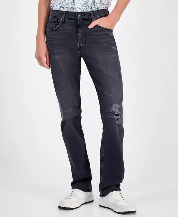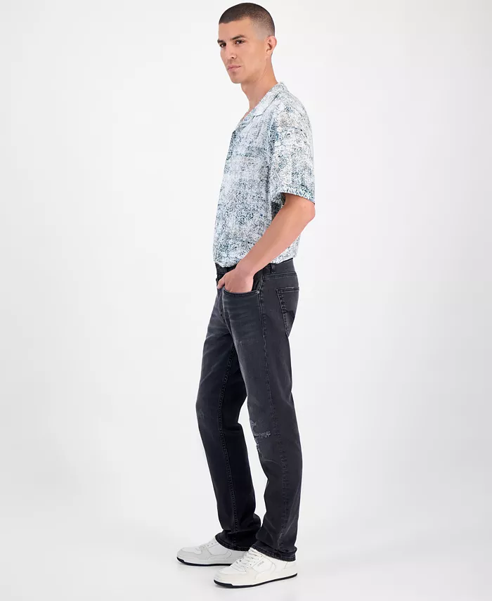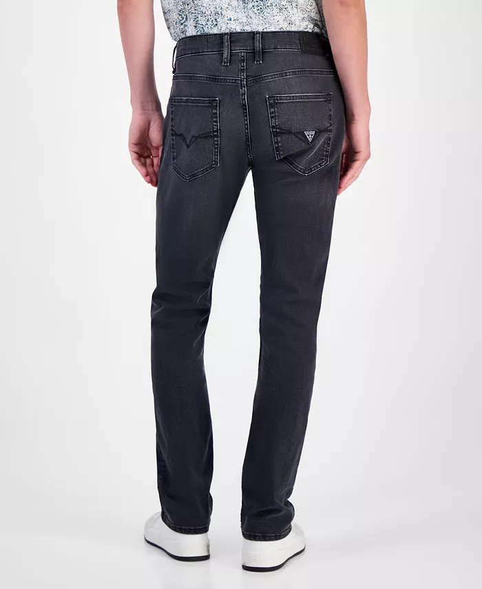 Джинсы Mateo GUESS темного цвета, с пятью карманами, застежкой на молнию и пуговицы, а также треугольным логотипом GUESS на заднем левом кармане. Модель прямого кроя.