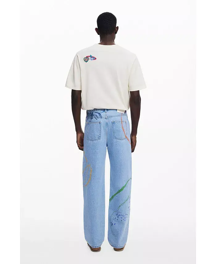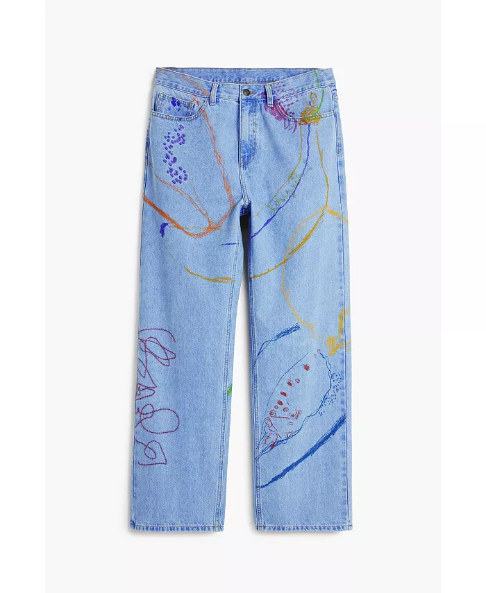Длинные свободные джинсовые брюки с художественными рисунками штрихами в стиле Arty в разных оттенках.