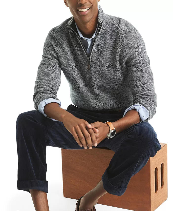 Добавьте изысканности в свой образ с этим свитером Nautica, сшитым из дышащего хлопкового трикотажа, который обеспечит вам длительный комфорт. Ребристая отделка, застежка-молния на четверть длины и фирменный логотип на груди завершают образ.