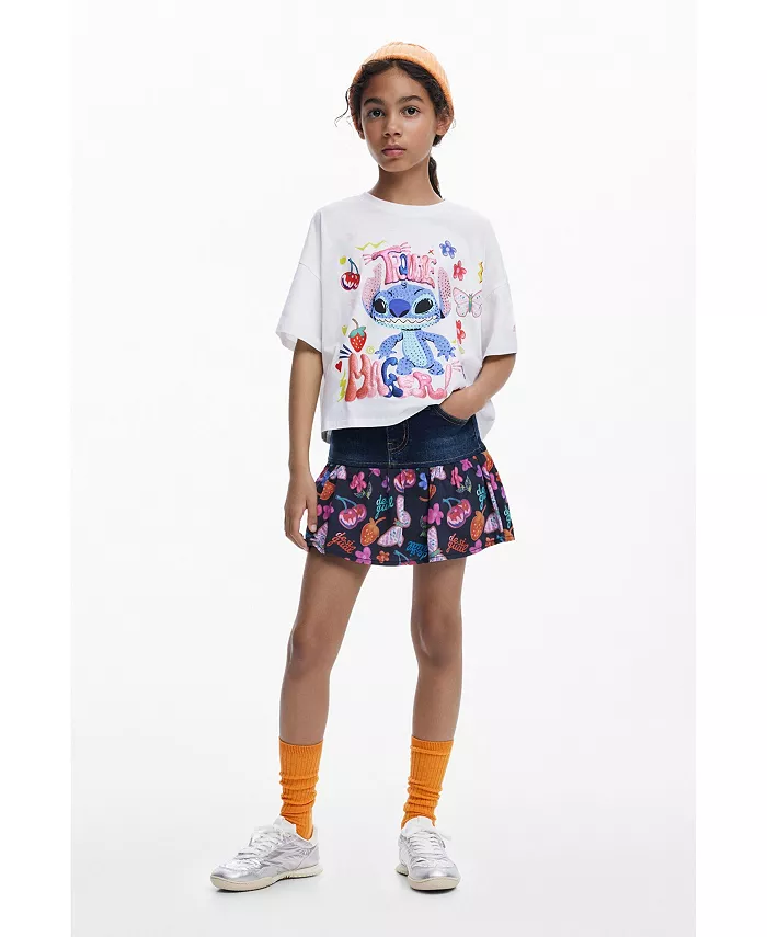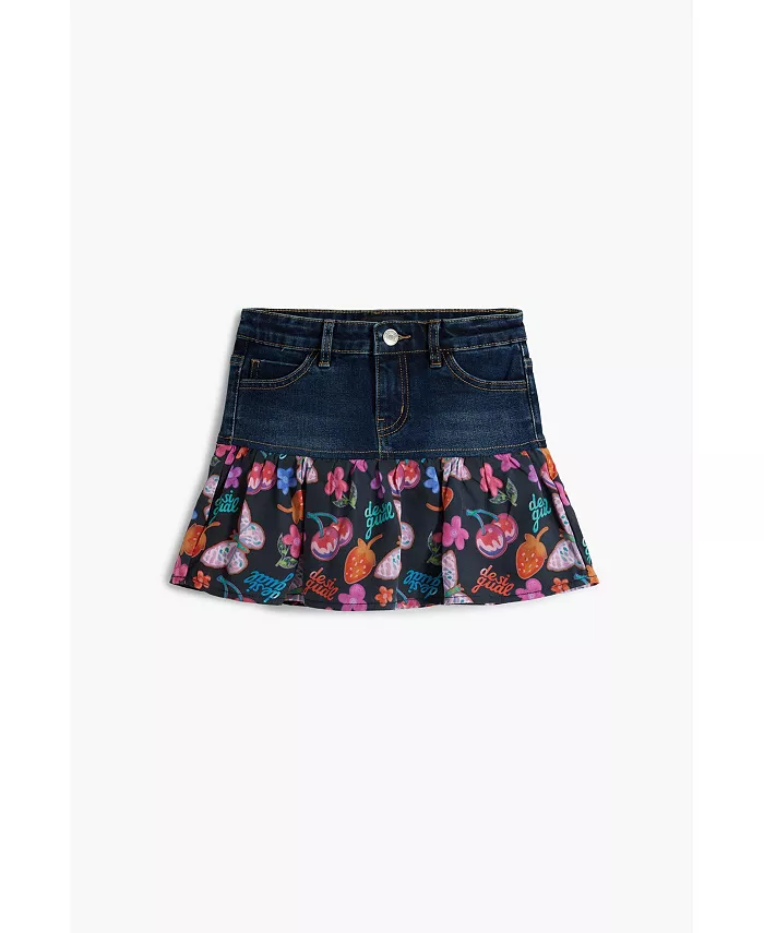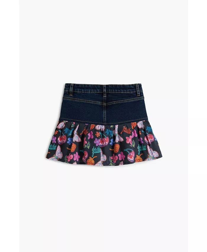 Короткая юбка мини-стиля из джинсовой ткани с эффектом потертости в сочетании с оборкой и аппликационным принтом.