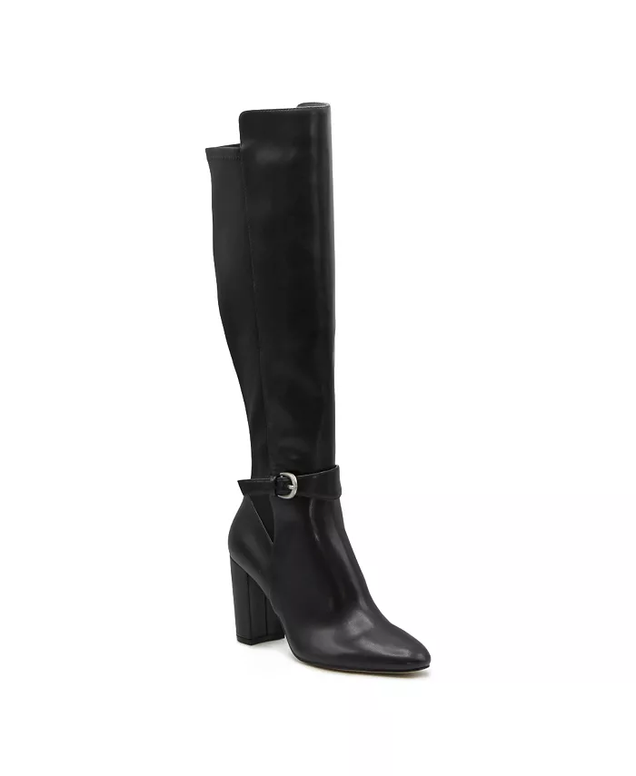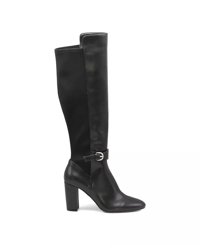 Миндалевидный носок и гладкий каблук с пряжкой сбоку уравновешивают этот силуэт выше колена.